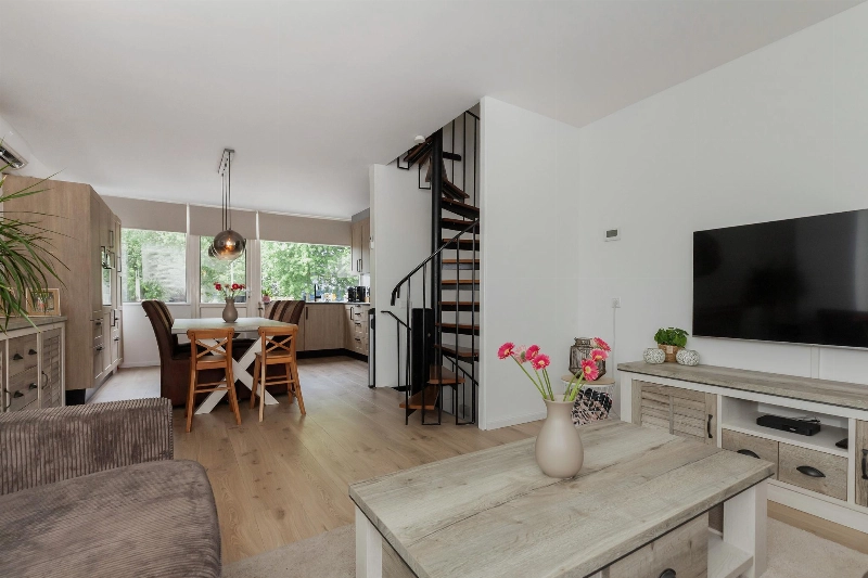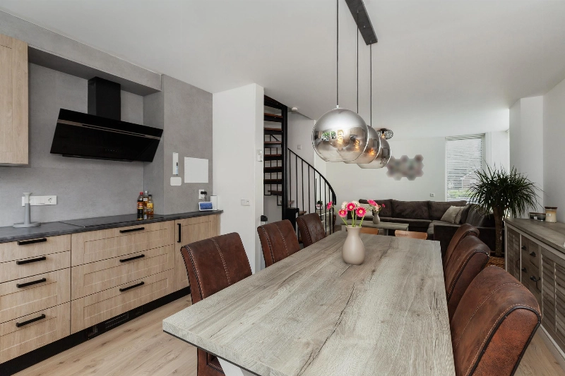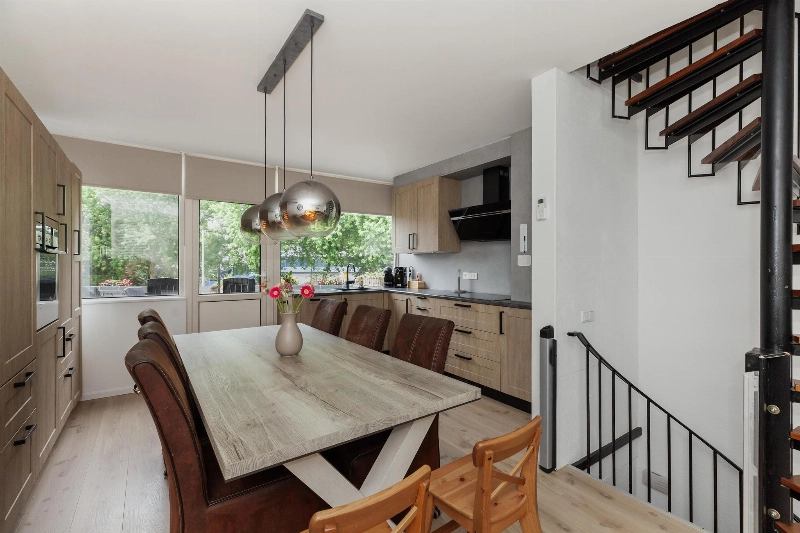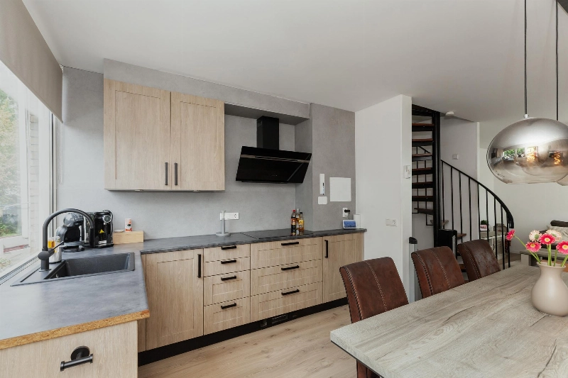 De woonkamer heeft een fijne zithoek met zijraam en een achterraam en aan de voorzijde bevindt zich een moderne keuken die in 2022 professioneel gewrapt is en voorzien van een nieuw aanrechtblad. Deze keuken is voorzien van een hoge wandopstelling en een lage opstelling en is voorzien van alle gemakken zoals: inductiekookplaat, een RVS afzuigkap, een koelkast met vriesvak, een vaatwasser en een combi-oven.