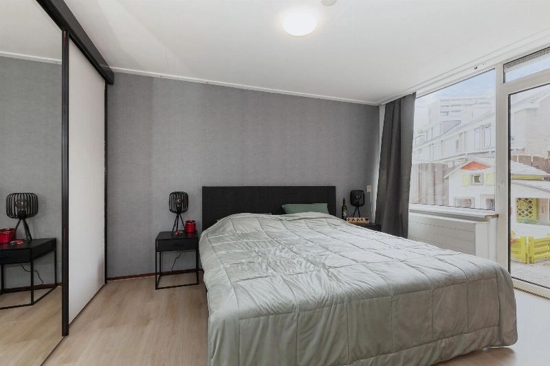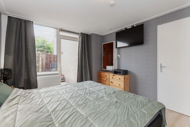 De ouderslaapkamer bevindt zich op de begane grond aan de achterzijde. Deze is voorzien van een vaste wastafel en heeft een deur naar de gezellige tuin. De tuin is gelegen op het noordoosten, heeft moderne bestrating met groene beplanting, een houten chalet en en achterom naar de steeg.