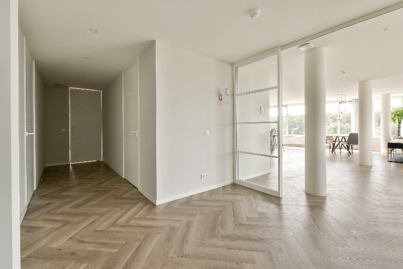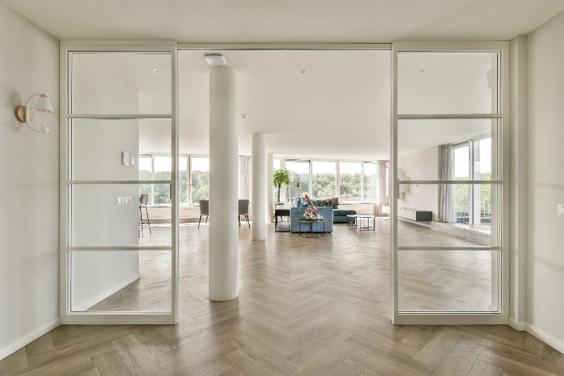Via de ruime hal is er via de witte stalen schuifpui een mooie doorkijk naar de living.