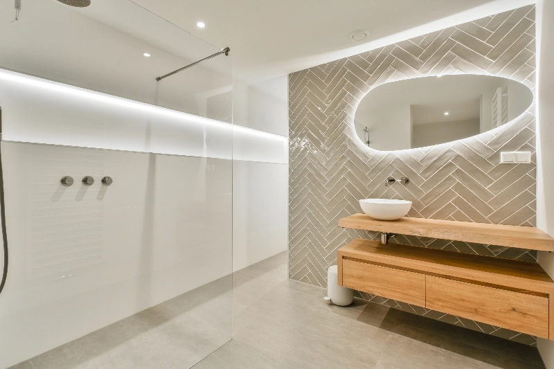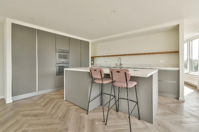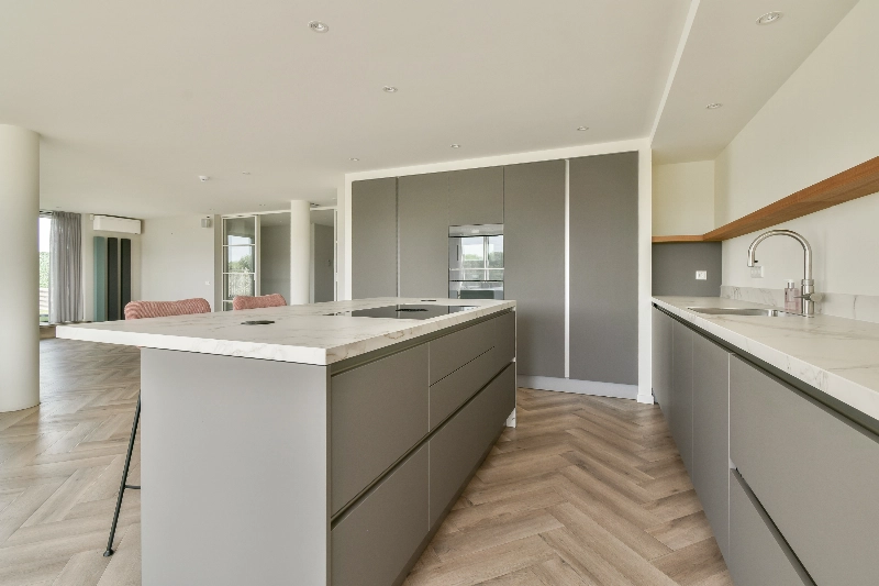De woonkamer is voorzien van een nieuw geplaatste keuken met een hoge wandopstelling en met veel kastruimte, koelkast en vriezer. De lage opstelling is voorzien van een vaatwasser en veel opbergruimte. Het kookeiland staat centraal en is voorzien van een inductiekookplaat met afzuiging en veel lades.