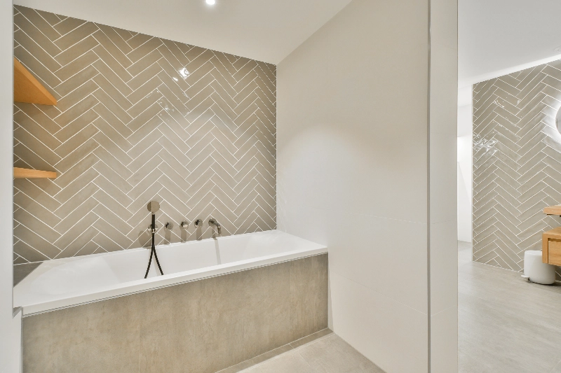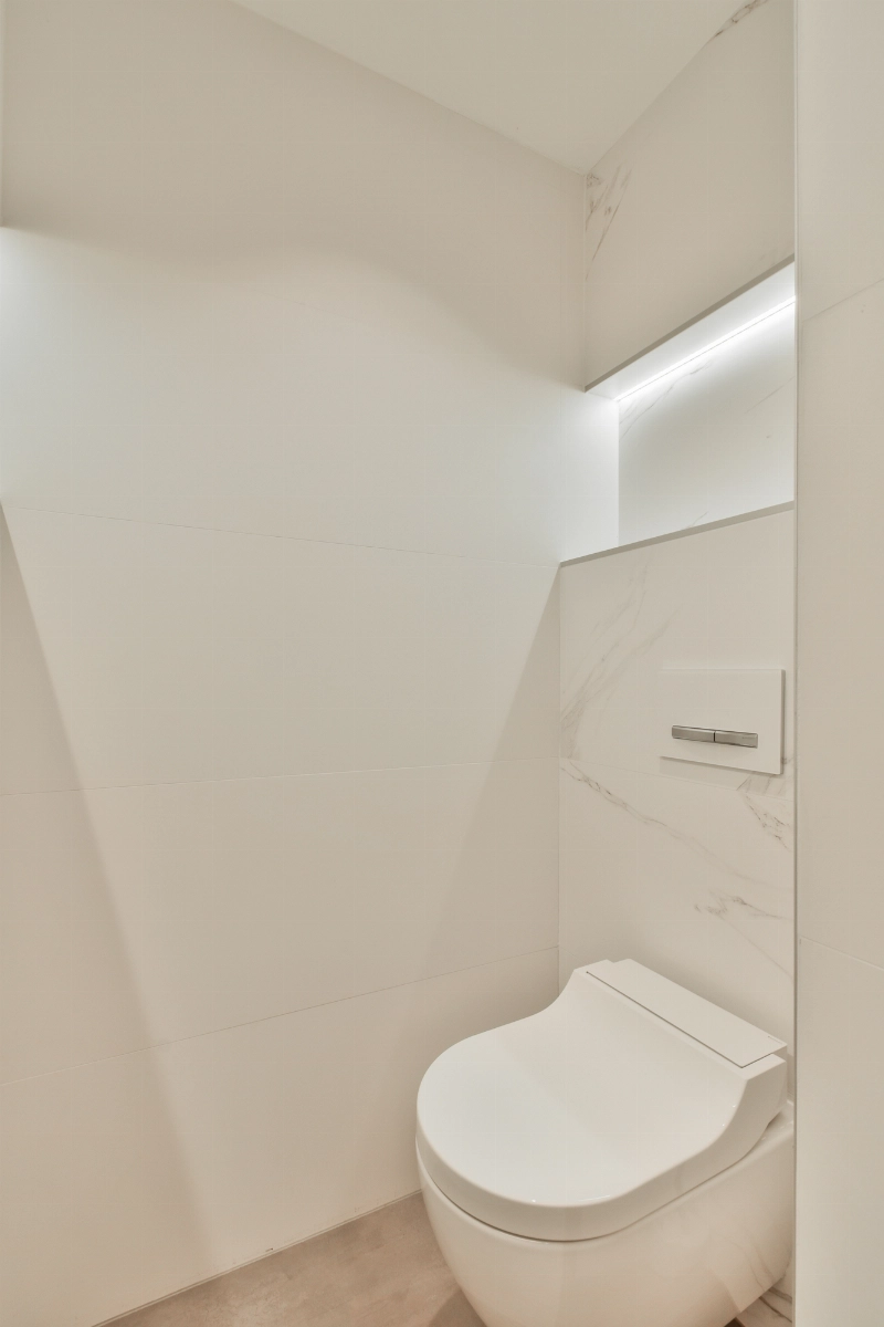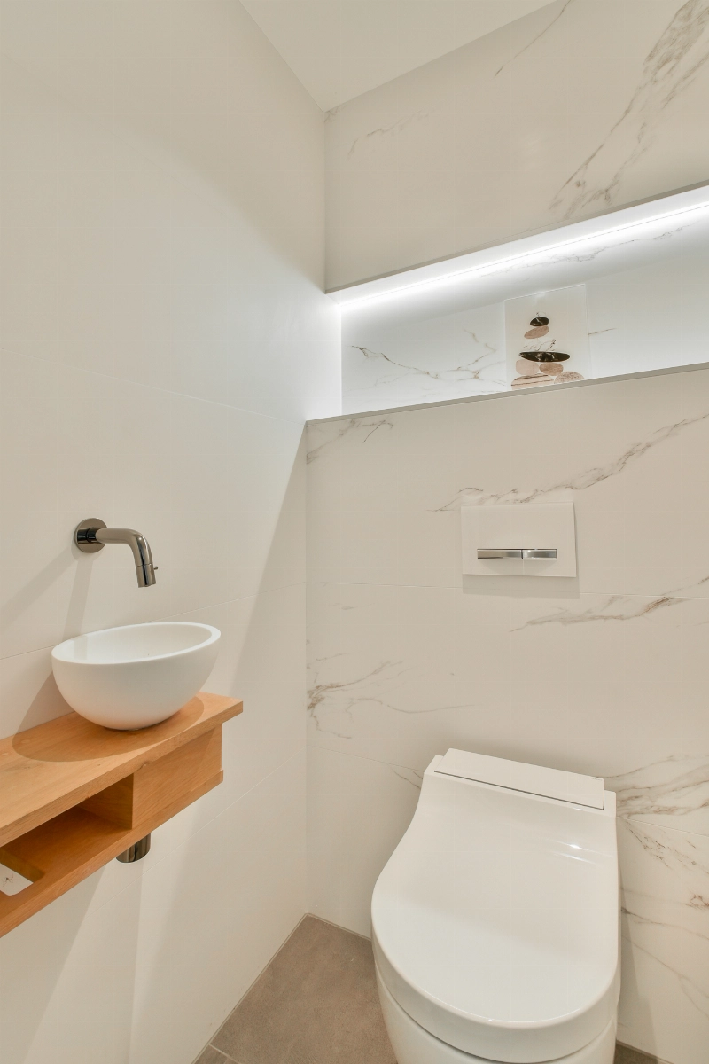 In de gang bevindt zich een gedeeltelijk betegeld toilet met marmerlook betegeling en een luxe handwasbakje.