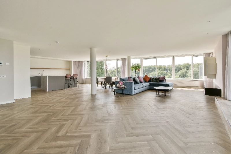 Deze woonkamer is maar liefst 80 m² groot, is voorzien van airco en heeft rondom ramen. Er is een schuifpui naar het zonnige dakterras waar je heerlijk kan genieten van al het moois in de omgeving! Het terras is voorzien van elektra, een watertappunt en zonwering.