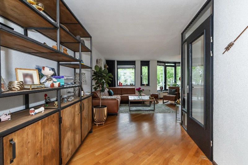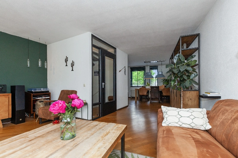 Het woonprogramma bevindt zich op de 1e verdieping. De royale doorzonwoonkamer met sfeervolle erker biedt volop licht en ruimte. Dankzij de handige pantry (2021) heb je altijd koffie, thee of een drankje binnen handbereik.
