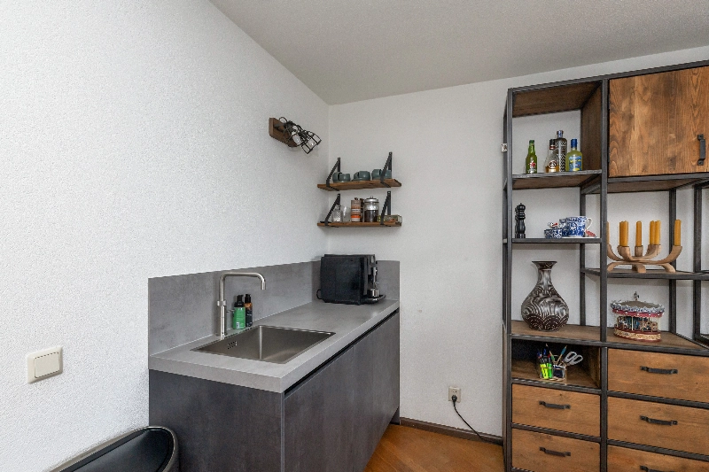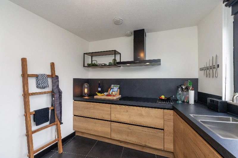 Aan de achterzijde van de woning bevindt zich de sfeervolle woonkeuken. Deze moderne keuken uit 2021 is uitgevoerd in een houtlook met een zwart MDF blad en voorzien van een inductiekookplaat, een zwarte afzuigkap, een vaatwasser en een Quooker . In het hoge kastengedeelte bevinden zich een koelkast, een vriezer en twee ovens. Verder heeft de keuken een mooie zwarte plavuizen vloer, veel opbergruimte en is er een mooie design radiator.