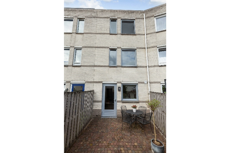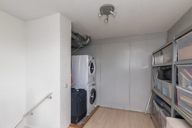 4e slaapkamer met de aansluitingen voor de wasmachine, droger en de opstelling van de c.v. ketel (Atag 2012). Een deur geeft toegang tot het fijne dakterras met bankirai vlonderdelen en mooie plantenbakken met een sproeiinstallatie en verlichting. Hier kunt u de gehele dag van de zon genieten.