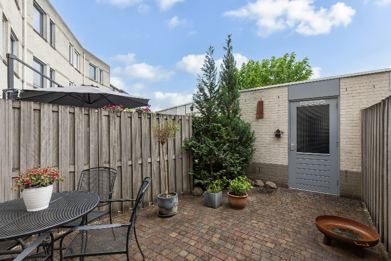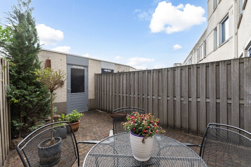 Een deur brengt je naar de op het oosten gelegen tuin met stenen berging. Hier kan je 's morgens heerlijk van het zonnetje genieten en de berging is voorzien van elektra.