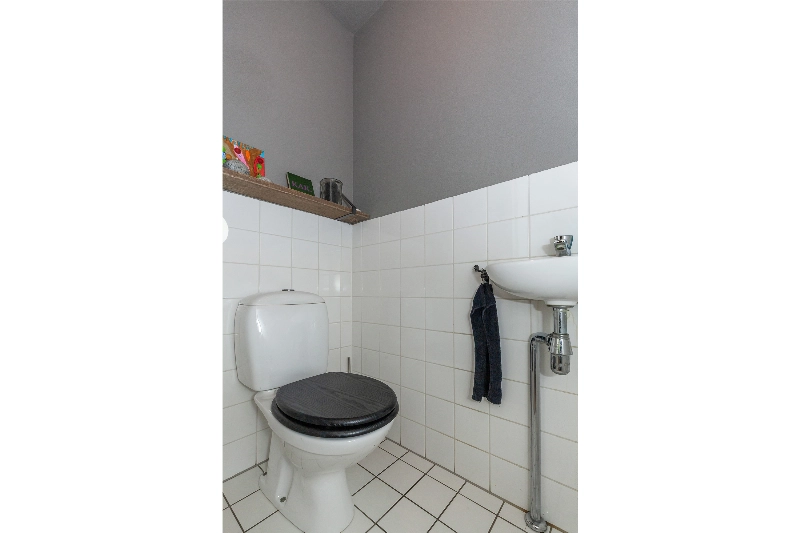 Er is een aparte toiletruimte met witte betegeling, een duoblok en een fonteintje.