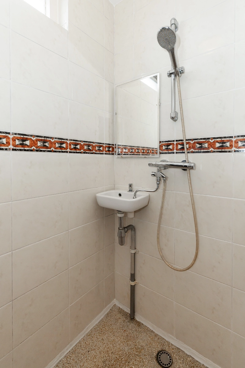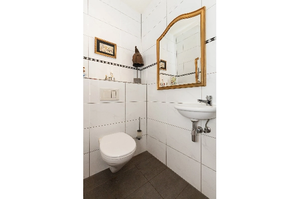 Op de overloop vindt u een gedeeltelijk betegelde toiletruimte met fontein en er is een aparte douchegelegenheid. Deze is voorzien van wandbetegeling, een granitovloer, douche en wastafel.