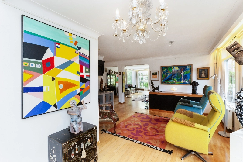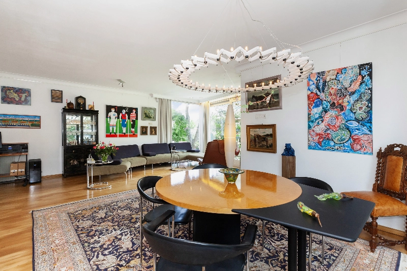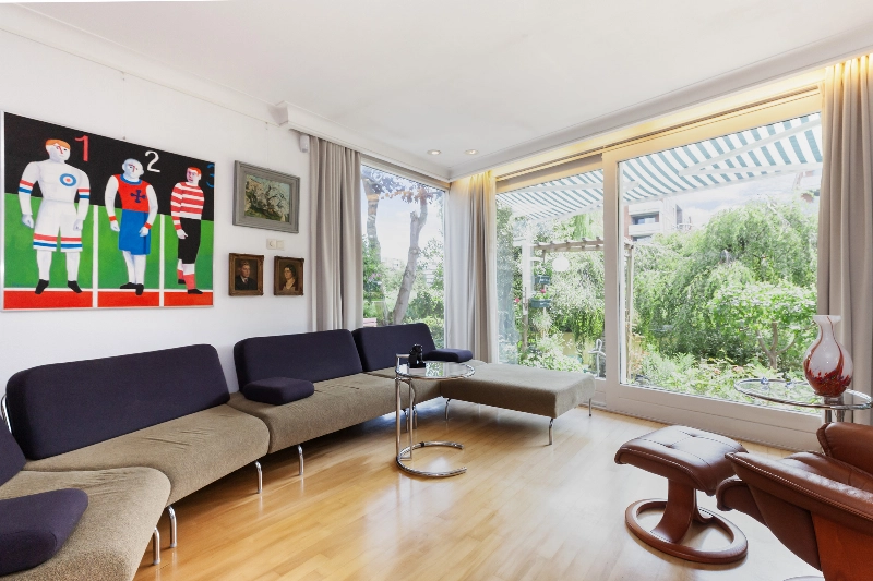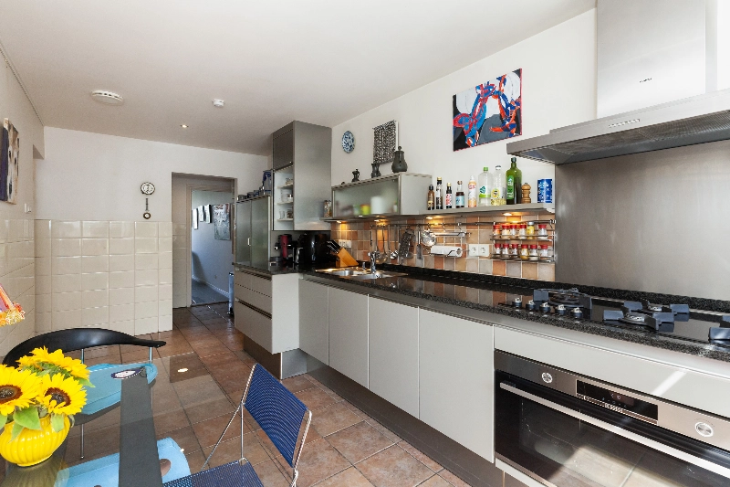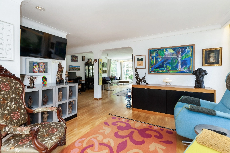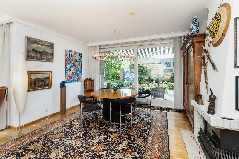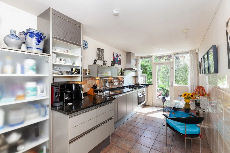 Uw auto parkeert u op eigen terrein en via de sfeervol aangelegde voortuin bereikt u de voordeur. Eenmaal binnen ziet u het kunstwerk van Jan de Winter en merkt u de ruimte en het licht in deze woning. De vloer van de hal is voorzien van travertin, er is een toiletruimte en een uitgebreide meterkast. Via de hal komt u in de woonkamer. Deze is opgedeeld in verschillende open ruimtes die allemaal met elkaar in verbinding staan. Of u dus een ruime werkplek wilt, of een grote eettafel wilt plaatsen om met vrienden aan te eten of u wenst een ruime zithoek met dat mooie zicht op de tuin... het kan hier allemaal! De vele raampartijen geven zicht op de tuin en er is een dubbele schuifpui naar de tuin. De open haard geeft extra sfeer tijdens de wintermaanden. Via de woonkamer bereikt u de keuken. Deze is voorzien van vloerverwarming en een rechte Siematic keukenopstelling met afzuigkap, 5 pits gaskookplaat en een oven. In een aparte nis is plek voor de vaatwasser en koelkast.