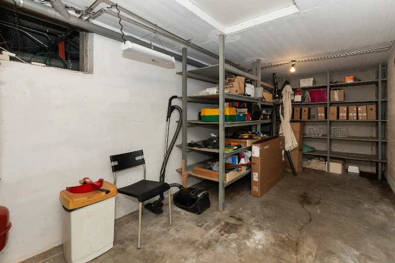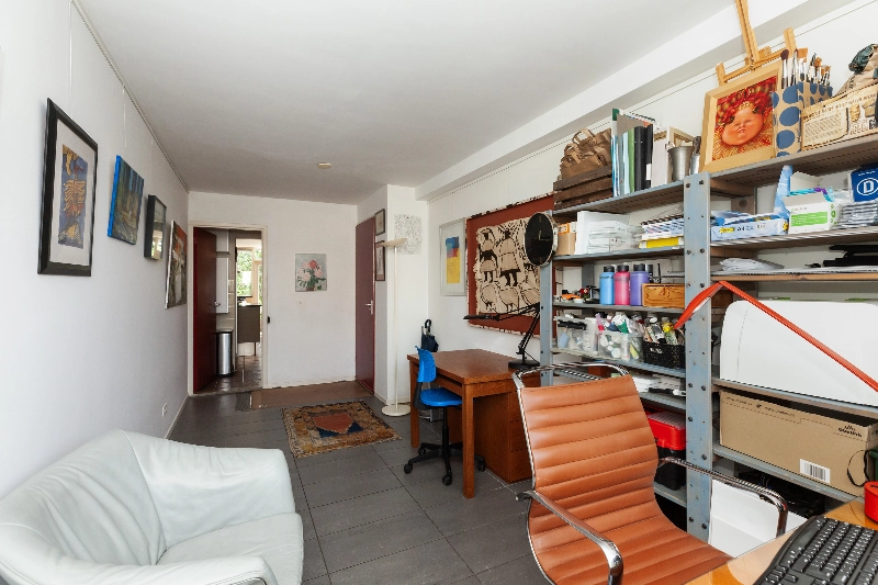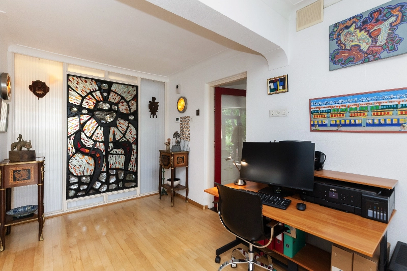 We lopen door en komen uit in de slaapkamer. Deze ruimte betreft de voormalige garage en is thans in gebruik als werkruimte. Onder de plavuizen ligt ook hier vloerverwarming en het luik geeft toegang tot de kelder van maar liefst 19m². Deze is op stahoogte en in 2023 is hier de hybride warmtepomp geplaatst.