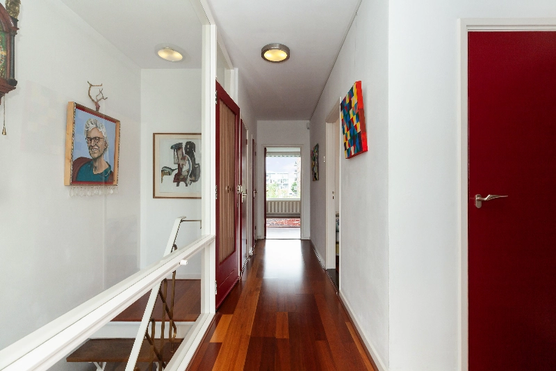 Hier is een mooie overloop met een prachtig raamwerk en veel lichtinval.