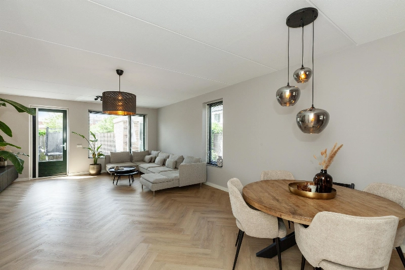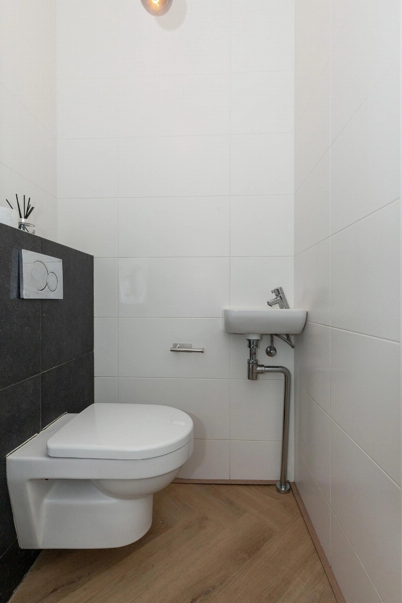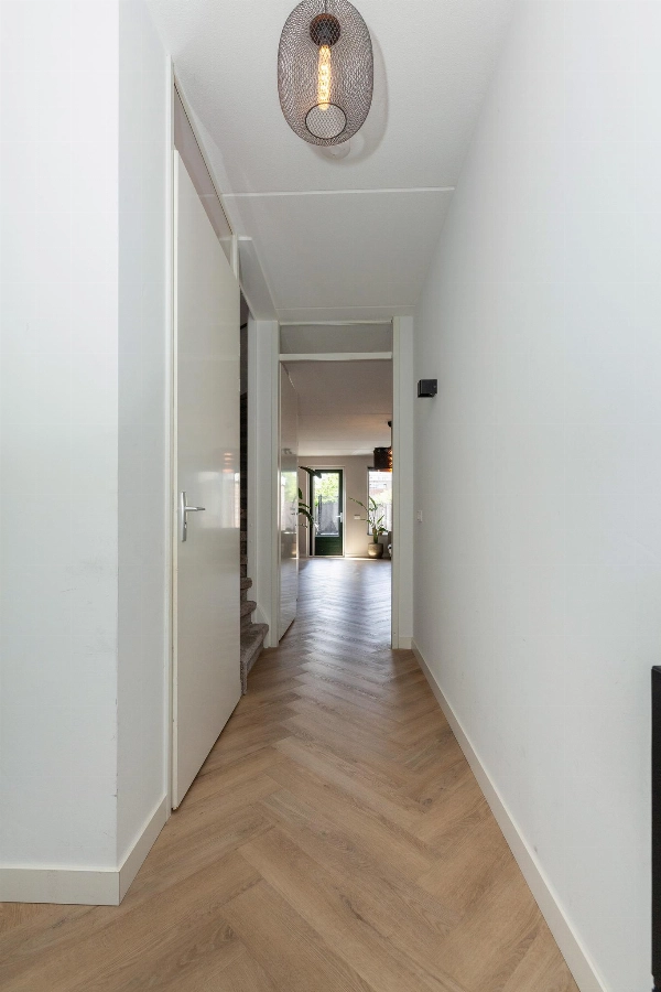 Nadat je je auto op je eigen parkeerplaats hebt geparkeerd, heb je middels de tuin of voortuin toegang tot de woning. De ruime entreehal is afgewerkt met een strakke PVC vloer die in visgraatmotief is gelegd en doorloopt naar de woonkamer. Hier vind je verder de geheel betegelde toiletruimte met hangend closet en fonteintje, de meterkast en de trapopgang naar de slaapverdieping. De woonkamer is door de uitbouw echt een ruime living! Hier heb je direct zicht op de fijne tuin en er is meer dan genoeg plek voor een grote hoekbank en eettafel! Het zijraam geeft een leuk en gezellig effect.