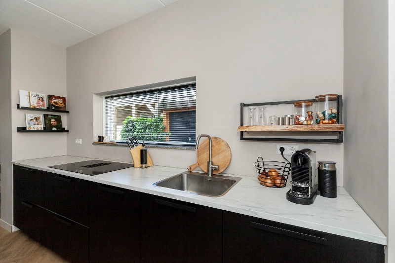 Aan de voorzijde van de woning bevindt zich de complete en moderne zwarte keukenopstelling met een hoge opstelling met vriezer, koelkast, oven, combimagnetron en onder het 2e zijraam staat de lage opstelling met marmerlook kunststof werkblad, spoelbak, vaatwasser, brede inductieplaat met geïntegreerde afzuiging en veel kastruimte. Via het keukenraam heb je zicht op het autovrije pad.