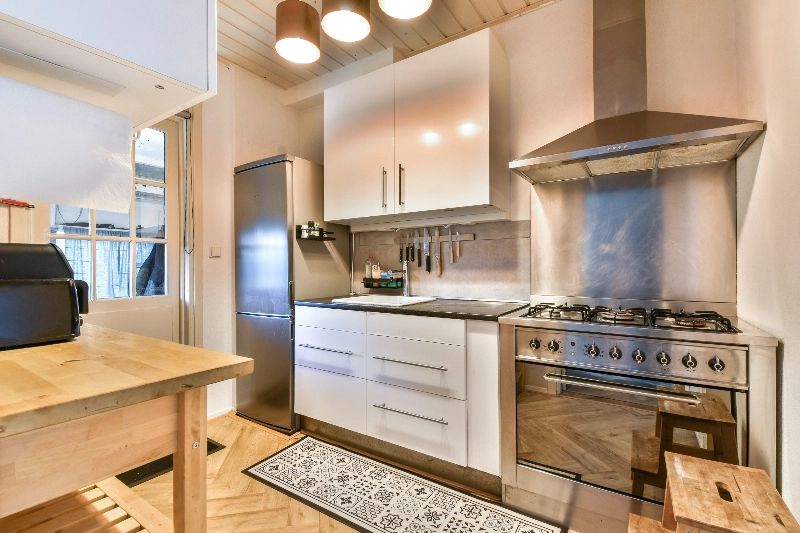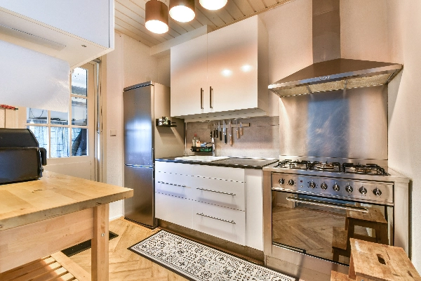 De gesloten keuken heeft een witte opstelling met een groot RVS fornuis met 5 pitten en een oven, een RVS afzuigkap en een losse koel-/vriescombinatie.