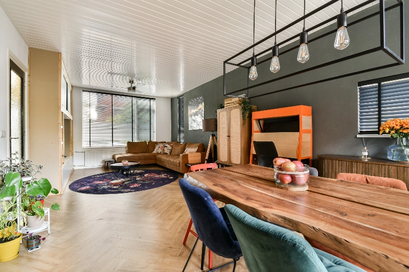 De doorzonwoonkamer geniet van optimaal daglicht dankzij de grote raampartijen aan de voor-en achterzijde én het zijraam. Op de vloer ligt een mooie visgraat laminaatvloer die doorloopt tot in de keuken.