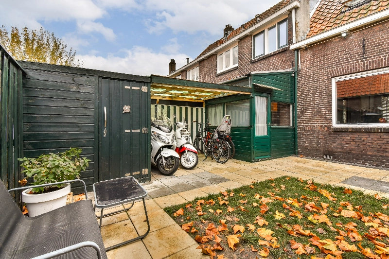 Via deze bijkeuken staat u zo in de achtertuin, die is ingericht met bestrating en gras. Onder de handige overkapping kunt u uw fietsen droog stallen. In de aangebouwde houten berging is ruimte voor al uw tuingereedschap.