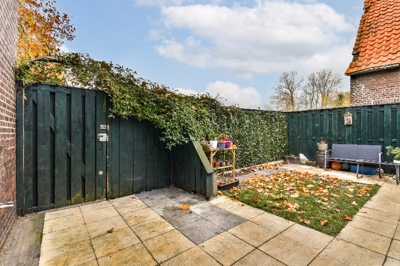 Een poortdeur in de schutting brengt u naar de zijtuin, waar u uw auto kunt parkeren. Op deze zijtuin rust een recht van overpad voor de naastgelegen buren.