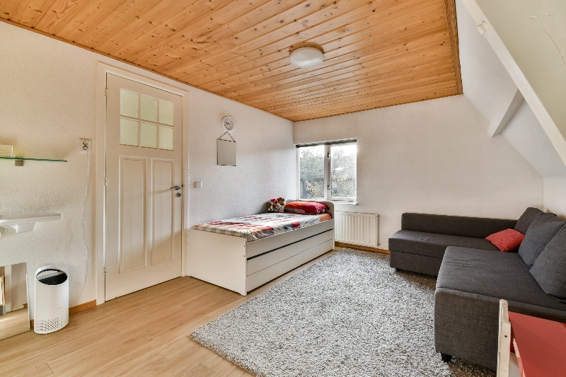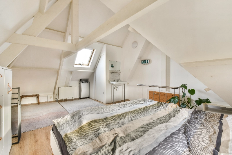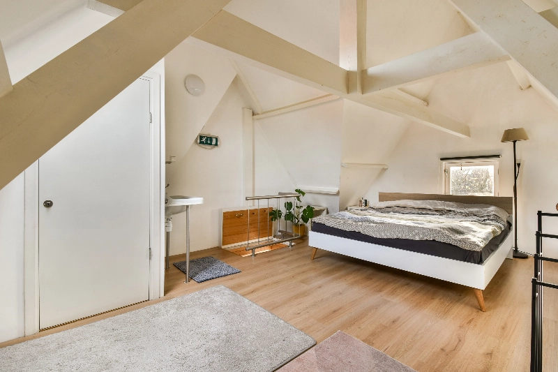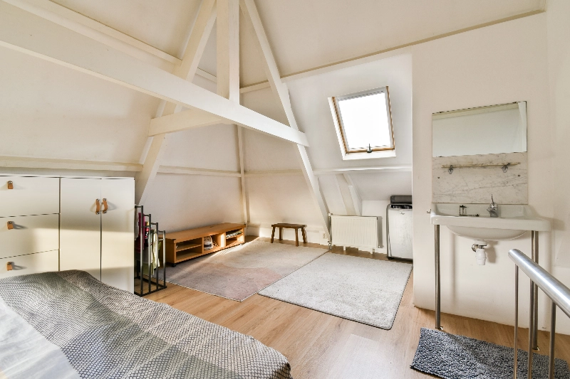 De verrassend grote zolderkamer is in gebruik is als slaapkamer en is afgewerkt met een houtkleurige laminaatvloer. Er is een aparte wastafel en een bergkast met de opstelling van de c.v. combiketel (Intergas 2023).