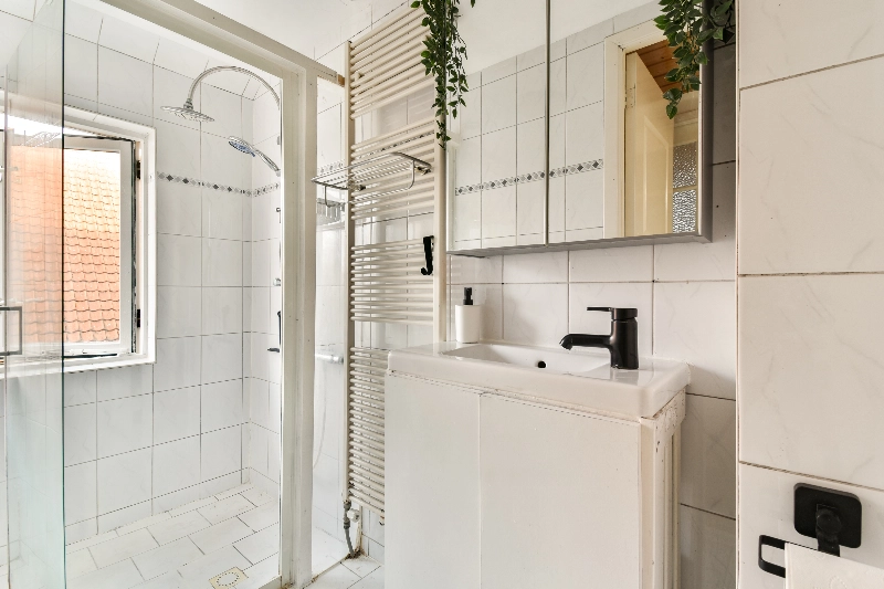 De wit betegelde badkamer beschikt over een douchehoek, een wastafelmeubel met spiegelkast, een handdoek radiator en een toilet.