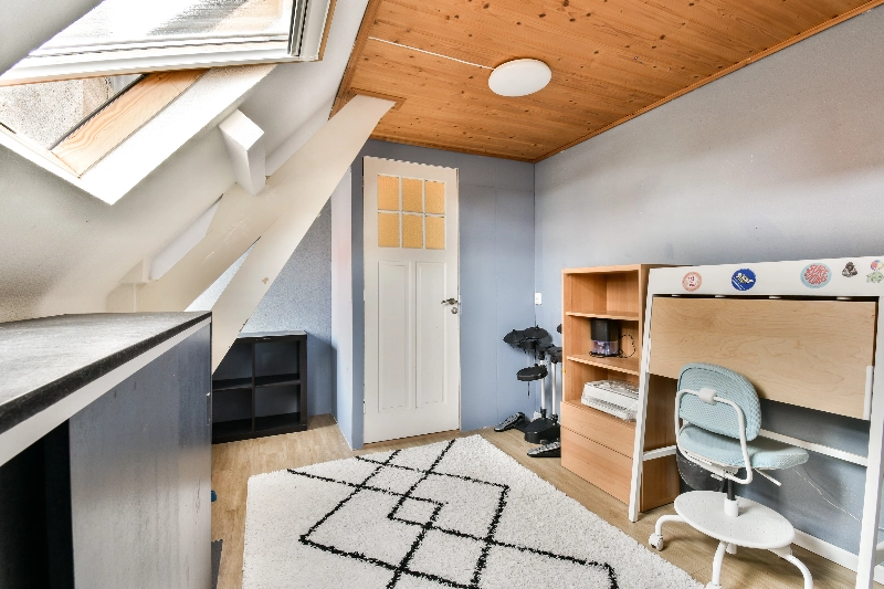 Aan de voorzijde van de woning bevindt zich een derde slaapkamer welke momenteel in gebruik is als werkruimte. Vanuit deze kamer bereikt u via een vaste trap de zolderverdieping.