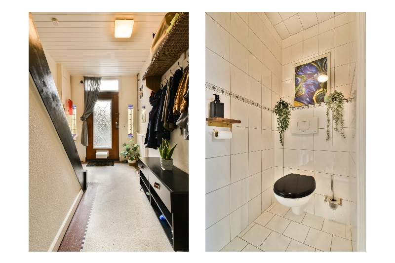 Het toilet is ruim opgezet en modern betegeld met witte wand- en vloertegels. Het is voorzien van een zwevend toilet, een urinoir en verwarming.