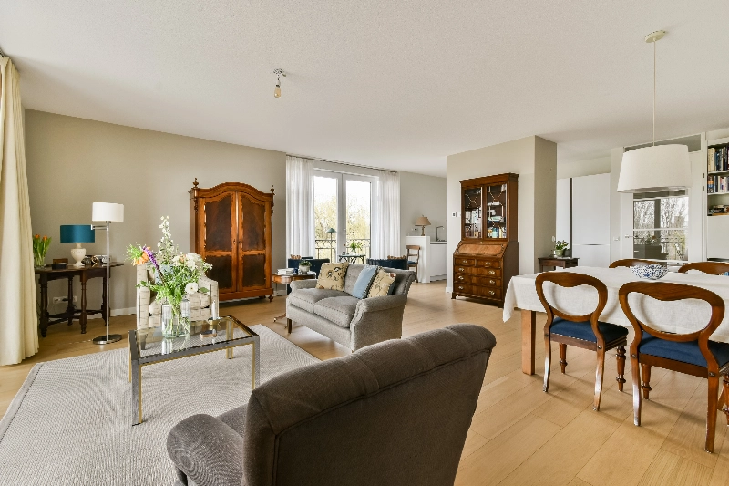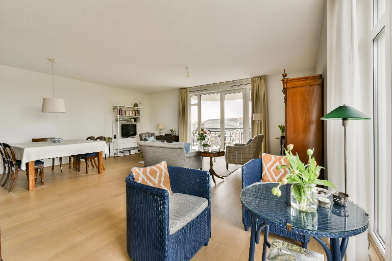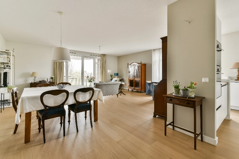 Aan het einde van de hal vindt u de mooie living met een prachtig uitzicht aan zowel de terraskant als de zijkant door het zijraam. De wanden zijn afgewerkt met renovlies en in een lichte kleur gesausd. Deze brede woonkamer is een fijne ruimte en heeft voldoende plek voor een riante zithoek en grote eettafel. Voor het zijraam is genoeg plek voor een extra zitje waar je heerlijk van de ochtendzon kunt genieten.