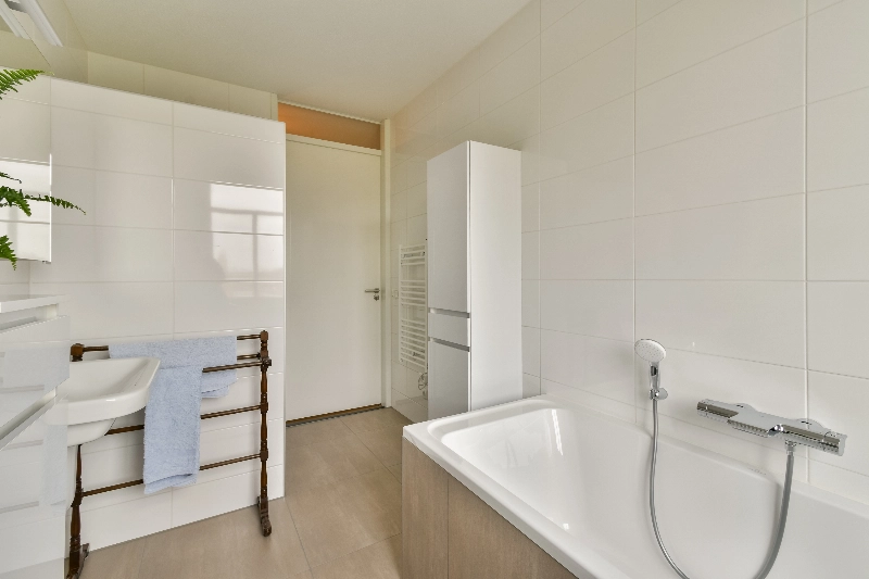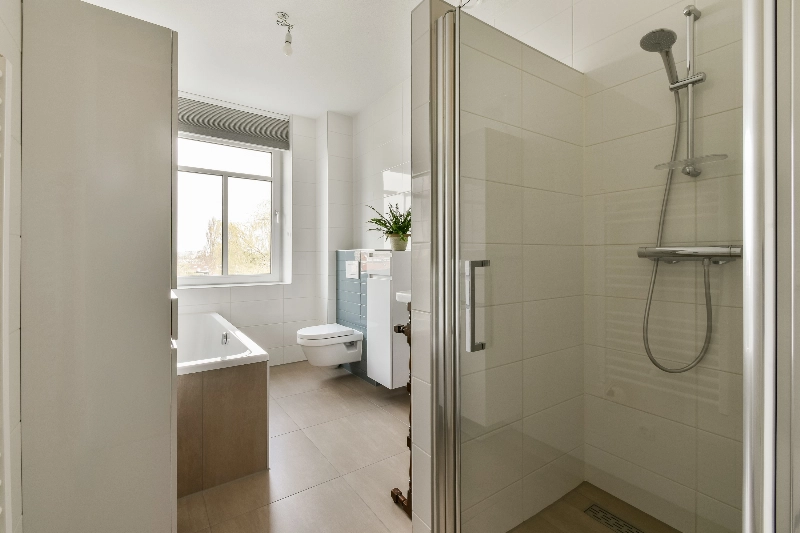 De badkamer is geheel luxe betegeld met witte wand- en zandkleurige vloertegels. Achter het toilet is een sfeervolle grijsblauwe betegeling aangebracht. In deze ruime badkamer vindt u een ligbad, douchehoek, handdoekenradiator, 2e toilet, wastafel en twee badkamerkasten waarvan één met geïntegreerde wasmand. Een raam zorgt voor fijn daglicht.