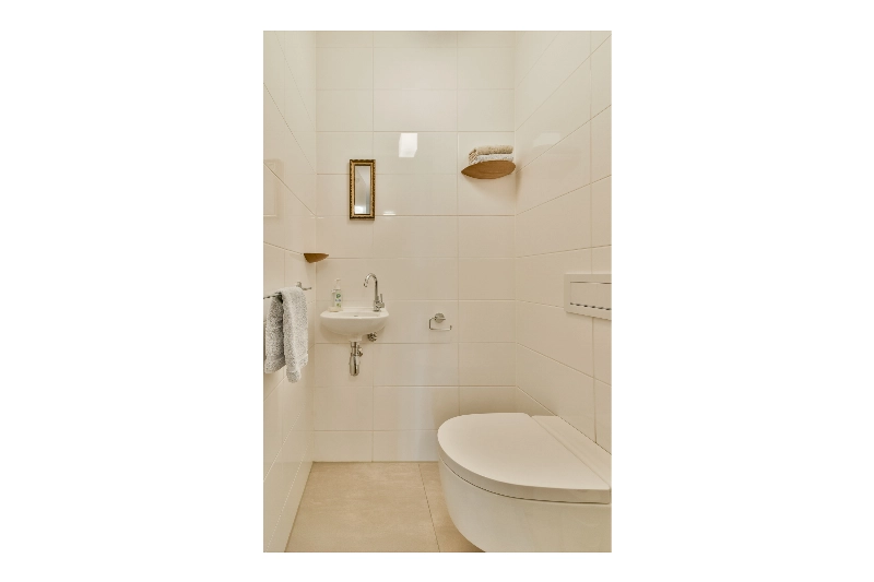 Het toilet is geheel wit/taupekleurig betegeld en voorzien van een Geberit douchetoilet en een fontein.