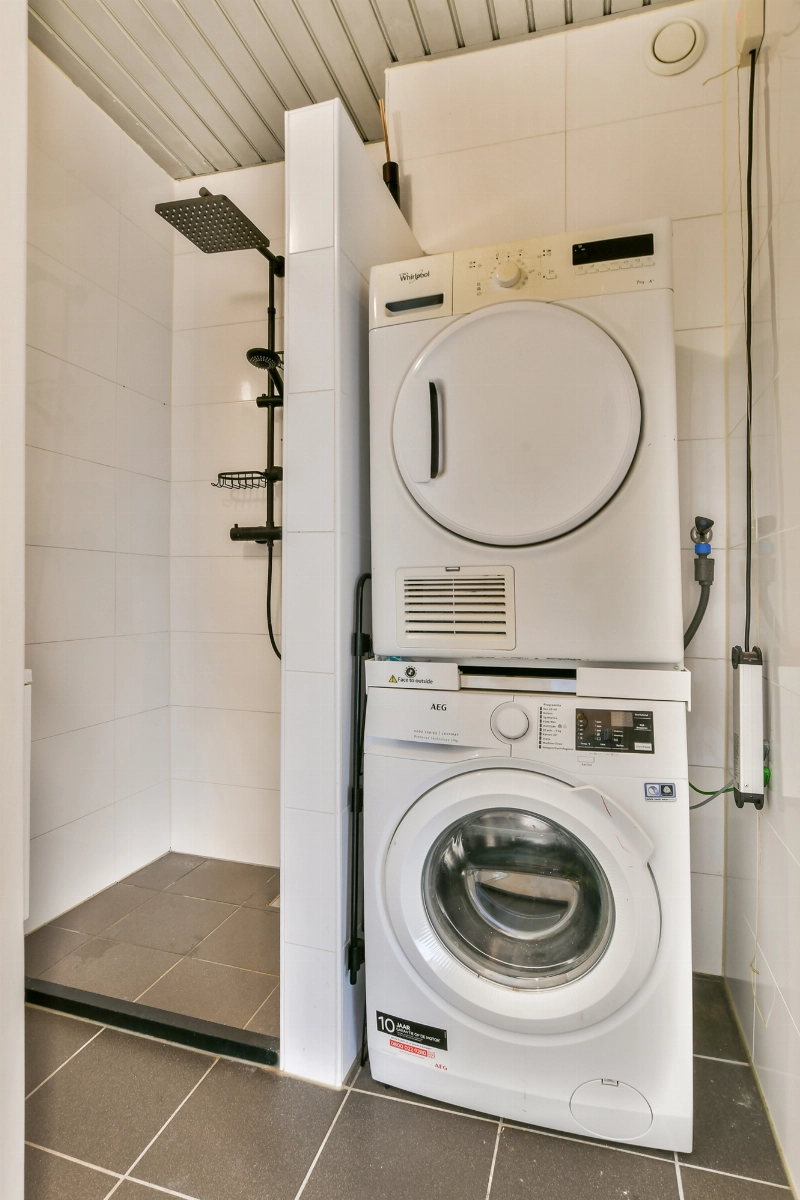 Voordeur, ruime entree hal met meterkast en vaste kast. Doorgang naar de hal alwaar de keurige toiletruimte en de modern betegelde badkamer is voorzien van witte wand- en grijze vloertegels, wastafel, doucheopstelling en opstelplaats voor de wasmachine en droger.