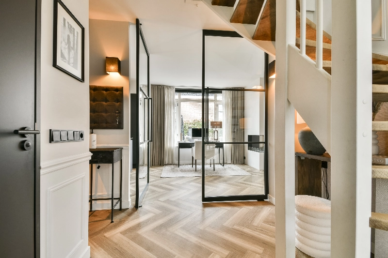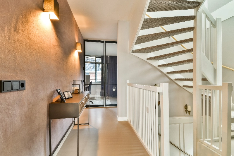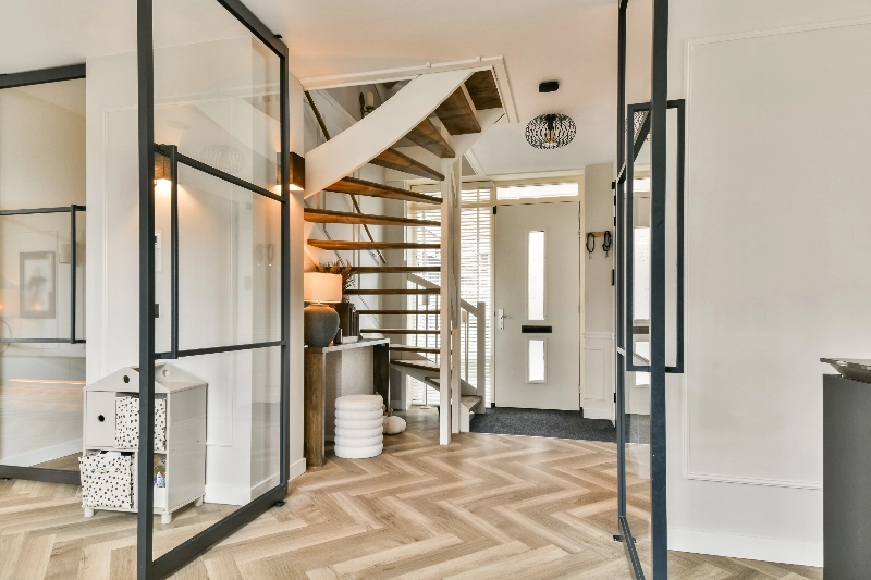 Via de oprit bereik je de voordeur die statig in de zijgevel is ontworpen. Eenmaal binnen sta je in een royale hal met open trap voorzien van lederen trapbekleding, lambrisering en een prachtige gietvloer die doorloopt in het toilet.
