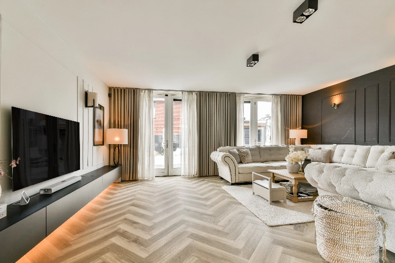 Via de openslaande Gers-deuren met vaste ramen bereik je de woonkamer. Wat een heerlijke ruimte! Het zijraam geeft extra daglicht en de in visgraat gelegde PVC vloer geeft samen met de lambrisering en strak afgewerkte plafond een mooi geheel.