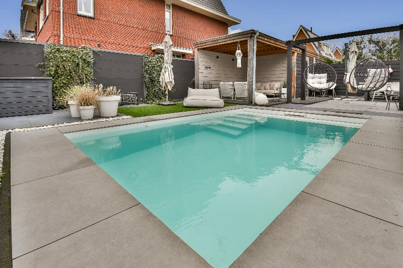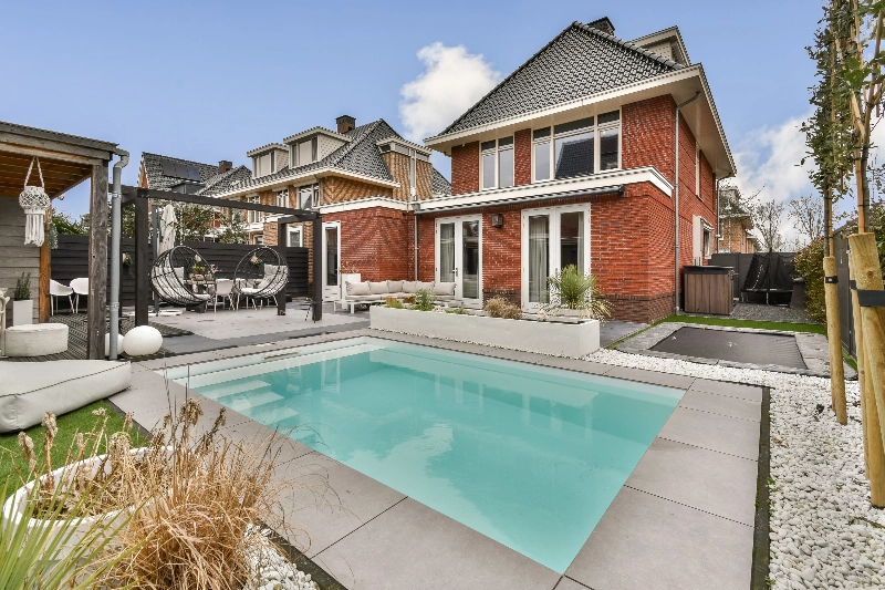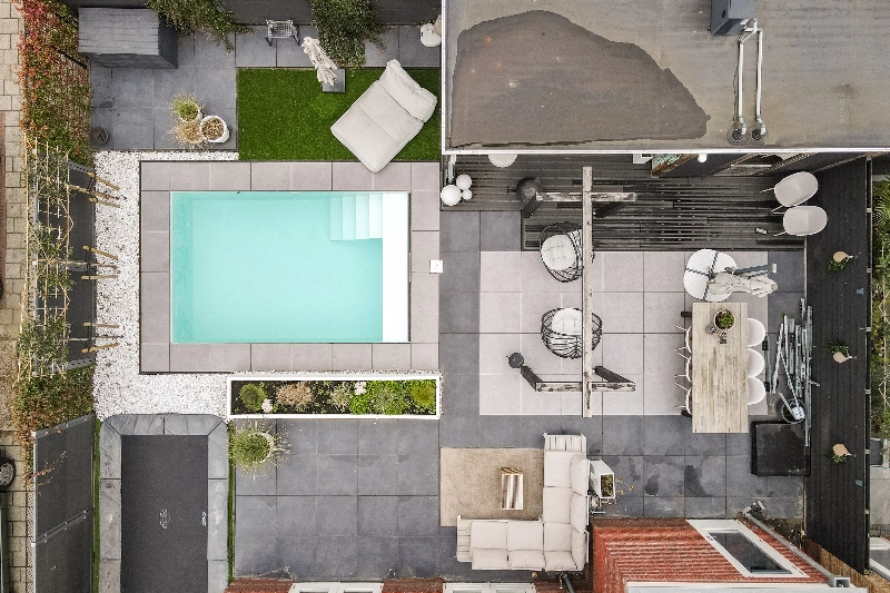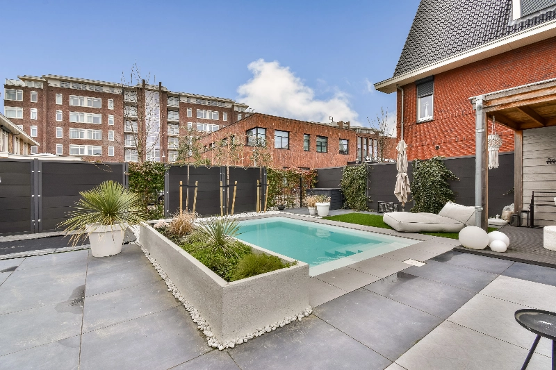 Er is voor de verwarming van het zwembad een aparte warmtepomp geplaatst en het zoutwaterzwembad is onderhoudsarm en kindveilig afgedekt met een solar-lamellendek.