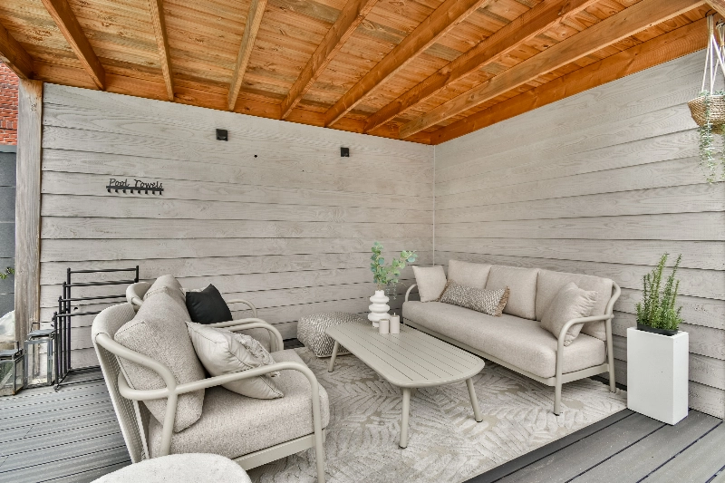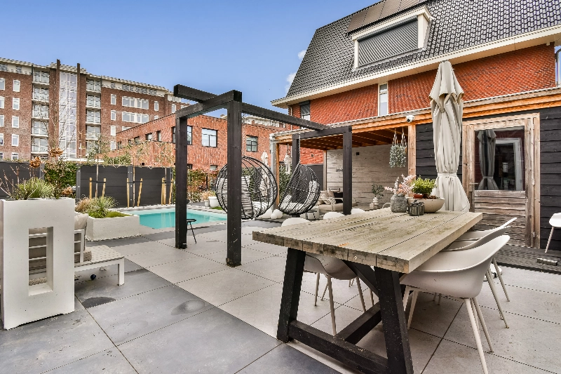 Recent is de begane grond rondom uitgerust met sfeervolle markiezen, die de uitstraling van de woning extra benadrukken.