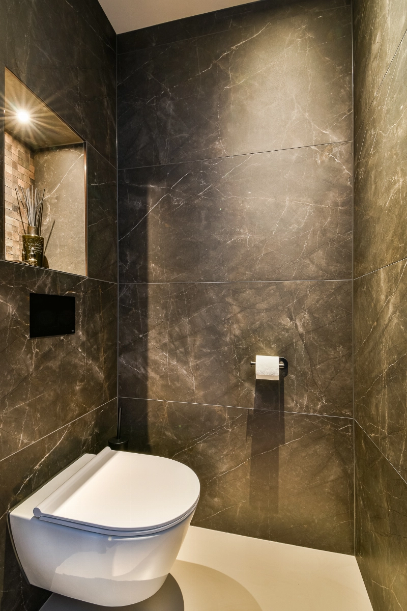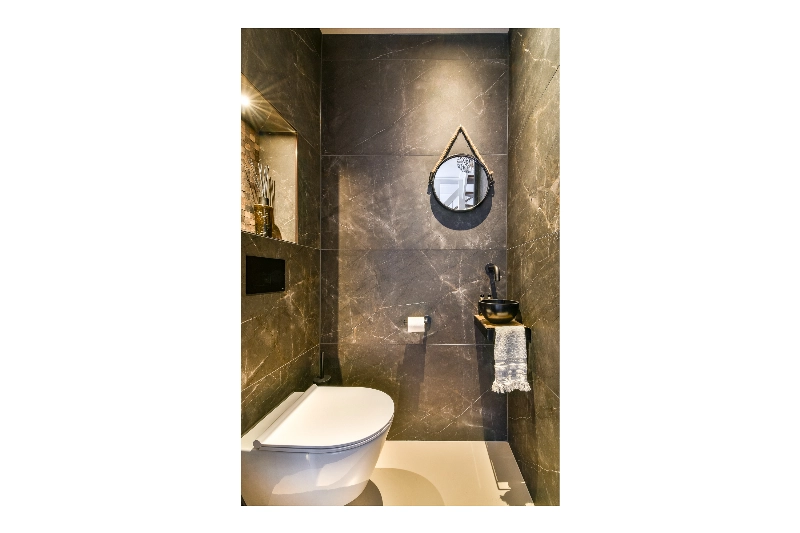 Het toilet is geheel betegeld met donkere marmerlook betegeling en afgewerkt met stijlvolle lederen mozaïkbetegeling, een zwevend closet, fontein en spots. De meterkast is uitgebreid en voorzien van 12 groepen, 3 aardlekschakelaars, een hoofschakelaar en 3-fasen aansluiting.
