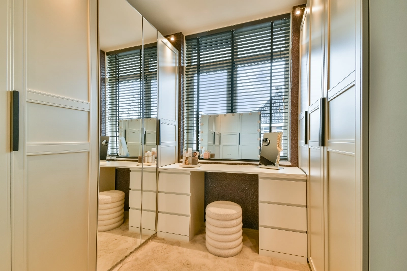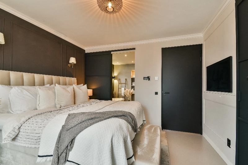 Slaapkamer I is gelegen aan de voorzijde en via de Gers- schuifdeur bereik je de aangrenzende kamer die thans volledig als kleedkamer is ingericht. De kastindeling inclusief kaptafel blijven dan ook achter. De badkamer ensuite bereik je via de schuifdeur in de slaapkamer en is werkelijk een wellness! Deze badkamer is luxe betegeld in combinatie met betonciré-stucwerk en heeft een breed eikenlook wastafelmeubel met dubbele waskom en een verwarmde en verlichte spiegel. De verouderde messingkranen bij de wastafel komen ook weer terug bij het vrijstaande bad en bij de inloopdouche met dubbele stortdouche. Het plafond is gestuct en voorzien van luxe, kleine spots.