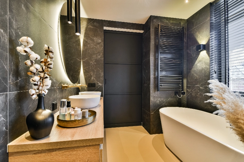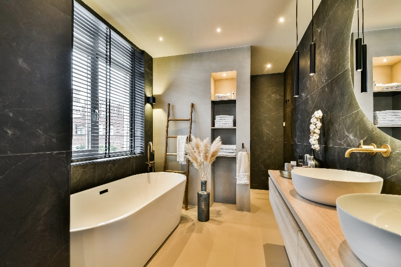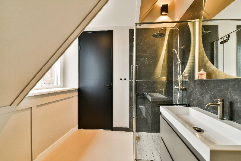 De 2e badkamer is afgewerkt met luxe betegeling, een inloopdouche met glazen wand, wastafelmeubel met verwarmde en verlichte spiegel en een 3e toilet.