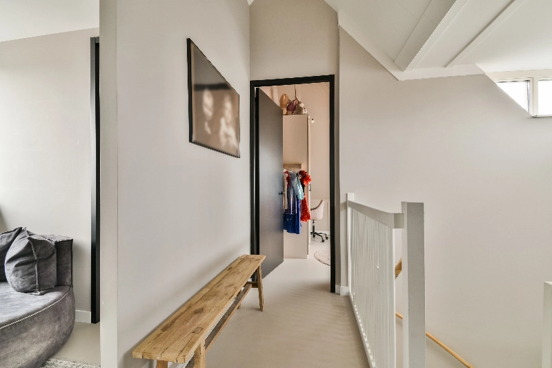 Via de fraaie trap bereik je de overloop met een 2e toilet. Dit toilet is op dezelfde wijze als het toilet op de begane grond afgewerkt. De indeling van deze verdieping is aangepast waardoor een luxe geheel is ontstaan. De vloer is afgewerkt met een strakke gietvloer en alle wanden zijn strak gestuct of voorzien van een luxe behang. Er is een extra vaste kast gecreëerd.