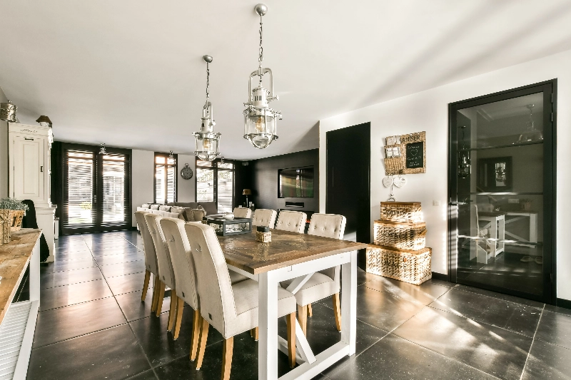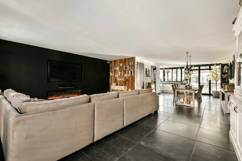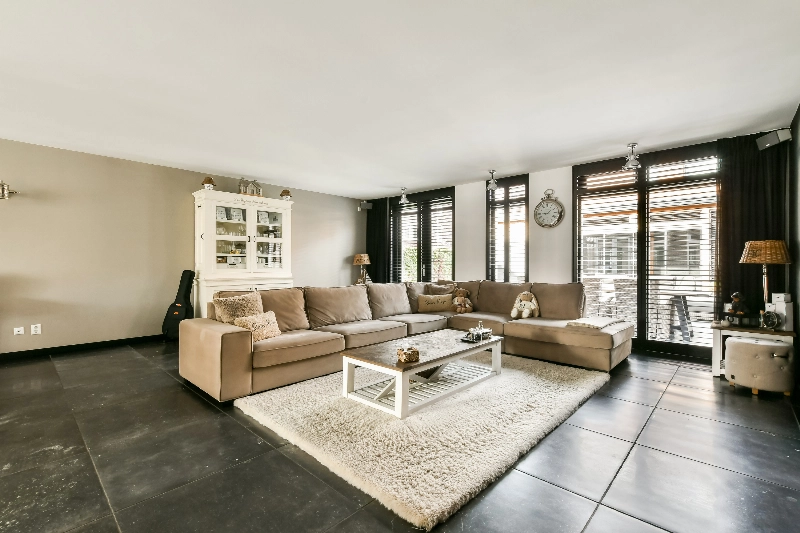 Via de staallook deur bereik je de woonkamer… wat een prachtige ruimte! De binnenbreedte van de woning is bijna 7 meter en dat zie je hier meteen terug. De uitbouw aan de achterzijde die vanuit de bouw direct is geplaatst geeft nog eens extra ruimte aan deze prachtige living! De wanden en het plafond zijn strak afgewerkt en deze ruimte is geheel voorzien van hardstenen plavuizen.