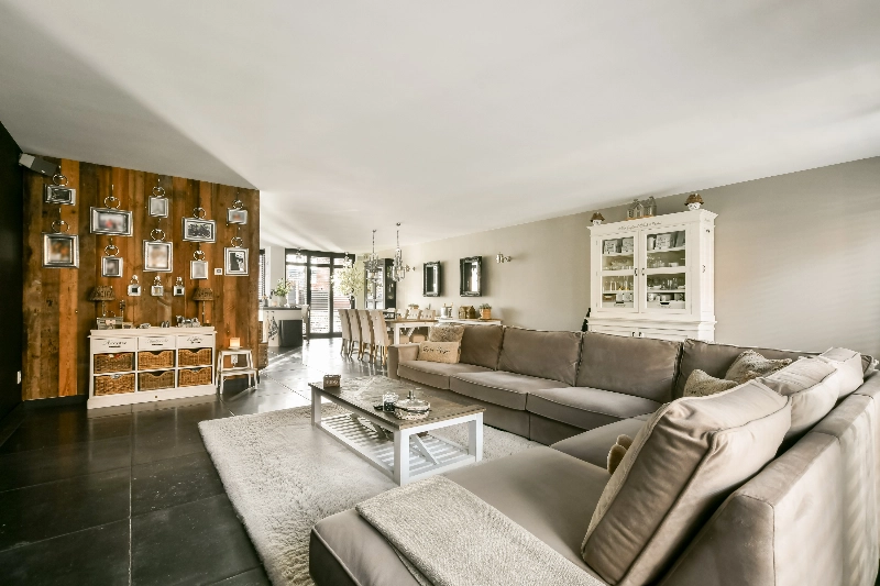 De woonkamer heeft een heerlijke ruimte zithoek met een grote wand voor de tv of haard, alles kan hier!