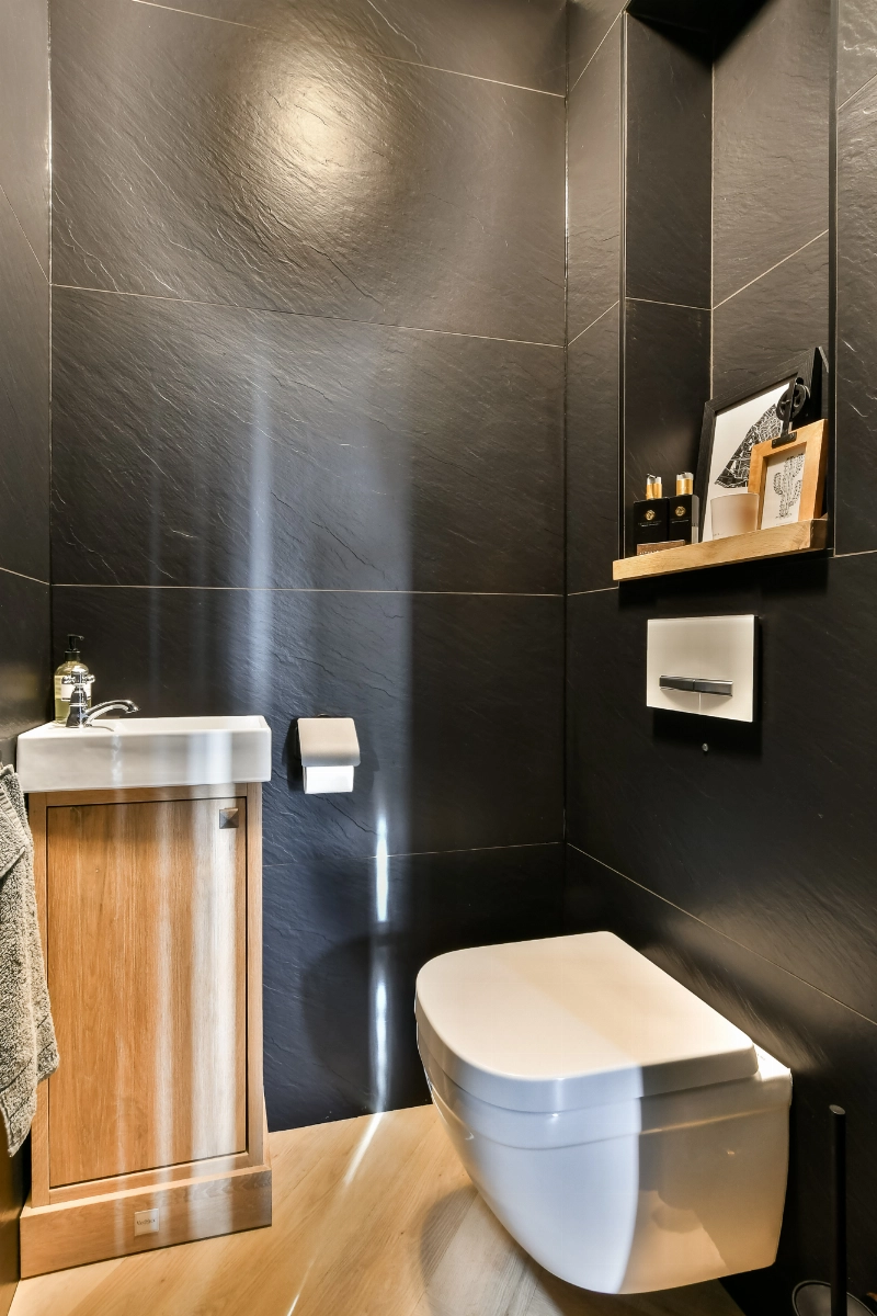 Via de verzorgde voortuin bereik je de voordeur. De entree van de woning is ruim met een gang met garderobe, een uitgebreide meterkast en een geheel zwart betegeld toilet voorzien van PVC vloer, zwevend closet en een houten meubel met fontein.