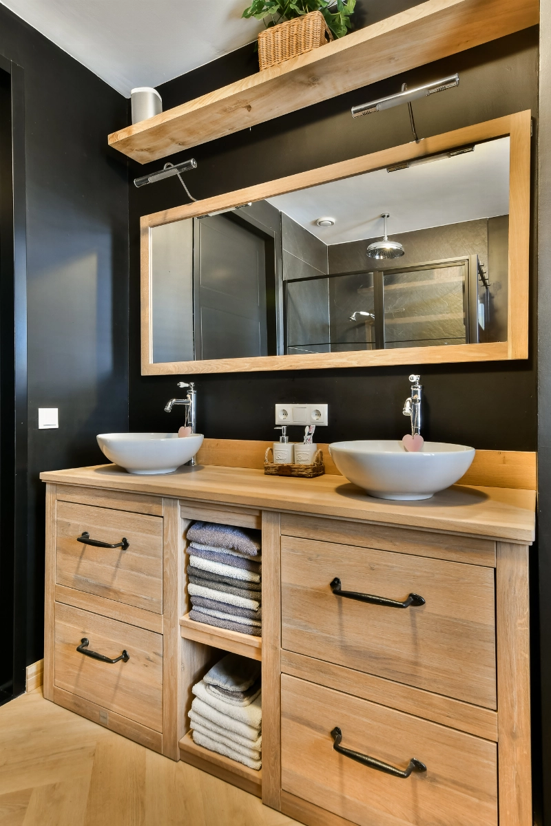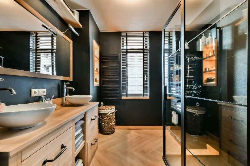 De badkamer is met net zoveel aandacht geplaatst. Deze is gedeeltelijk luxe betegeld en de vloer is voorzien van PVC. Er is een grote inloopdouche met staallook douchescherm, kunststof vloer en een regendouche. Het eiken badkamermeubel is de eyecatcher en is voorzien van een dubbele waskom. Tevens vind je hier 3 handige vakken voor je spullen, een spiegel met verlichting, een handdoekenradiator en een zijraam voor daglicht.