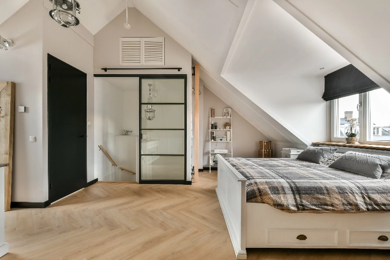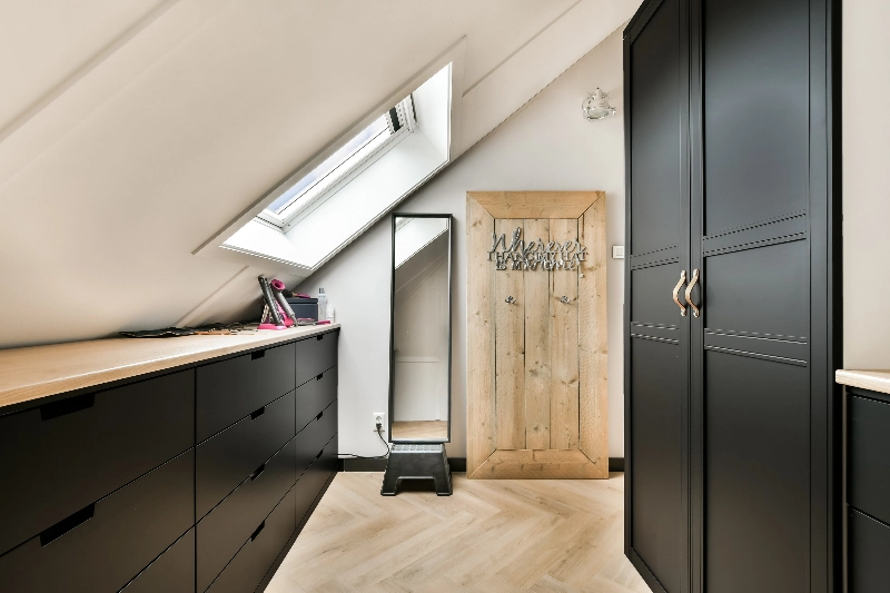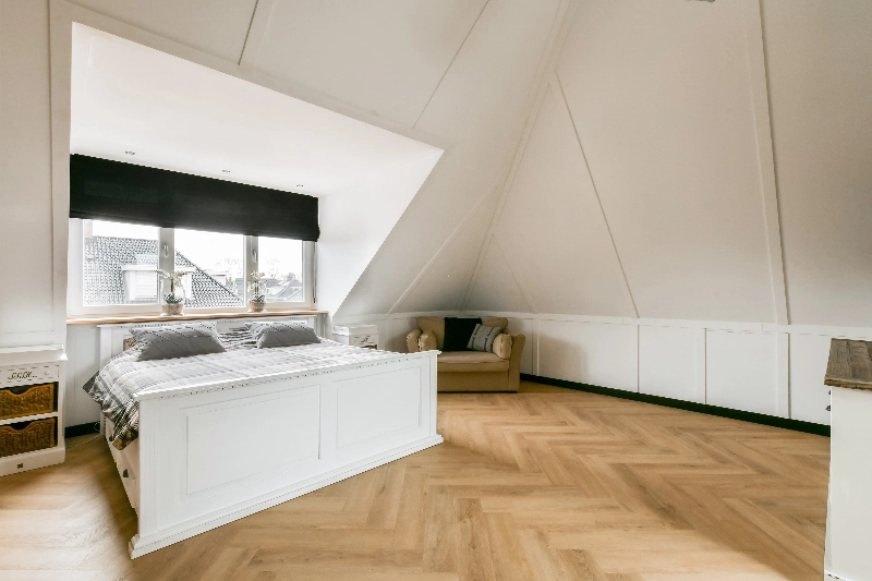We lopen door naar de zolder en komen via de staallook schuifdeur de zolderkamer binnen. Deze grote, open ruimte is met liefde afgewerkt. De vloer is geheel voorzien van PVC er is een dakkapel aan de voorzijde geplaatst en via deze slaapkamer loop je door naar de aangrenzende kleedkamer met kastindeling. Een dakraam zorgt hier voor extra lichtinval.