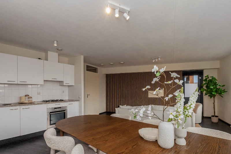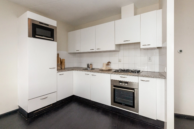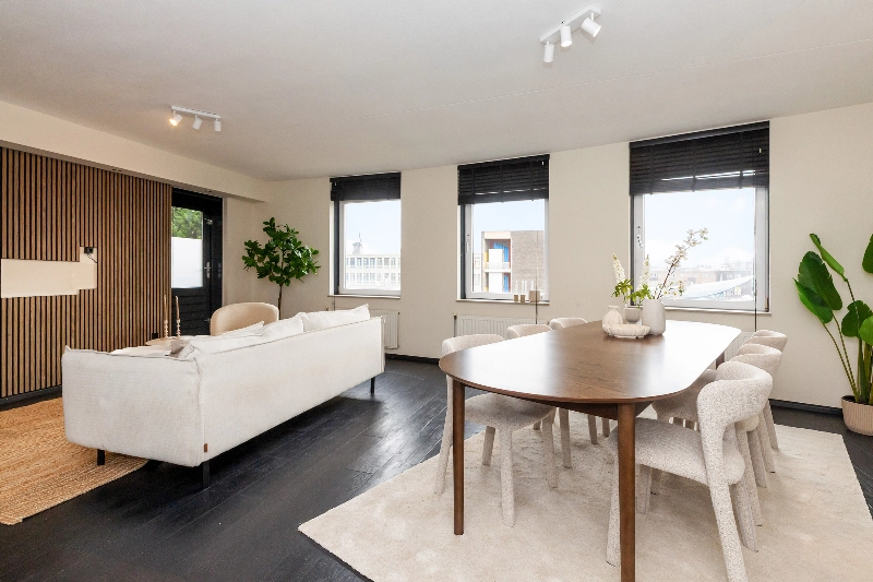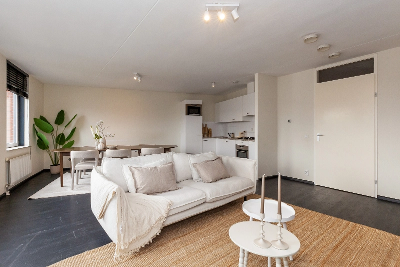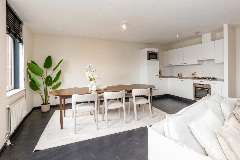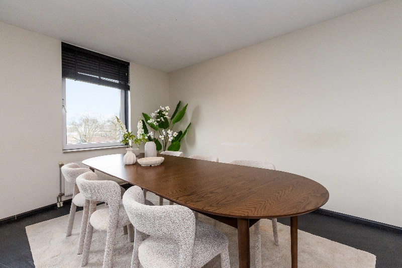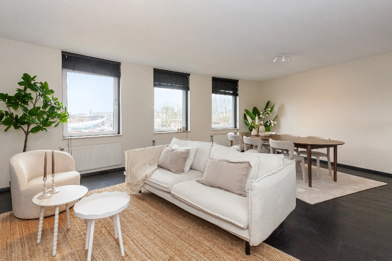 Wat een fijne woonkamer! Grote ramen zorgen voor veel natuurlijk daglicht en de open indeling biedt volop mogelijkheden voor het creëren van een gezellige zithoek en een aparte eethoek. Er is een 2e deur naar het ruime balkon. Hier kan je genieten tijdens de warme dagen.