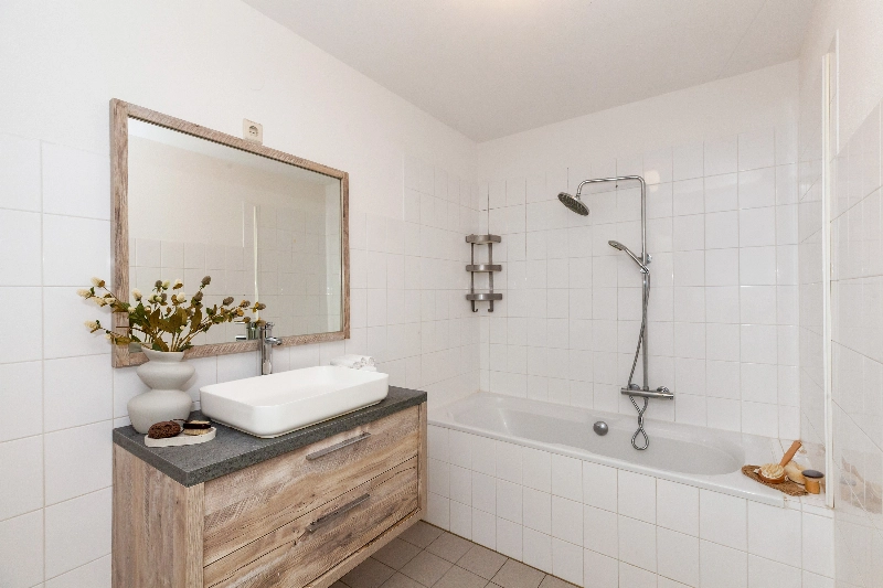 De keurig afgewerkte badkamer is voorzien van lichtgrijze vloer- en witte wandbetegeling en is afgewerkt met een ligbad met douchescherm en een eikenlook wastafelmeubel met waskom en spiegel.