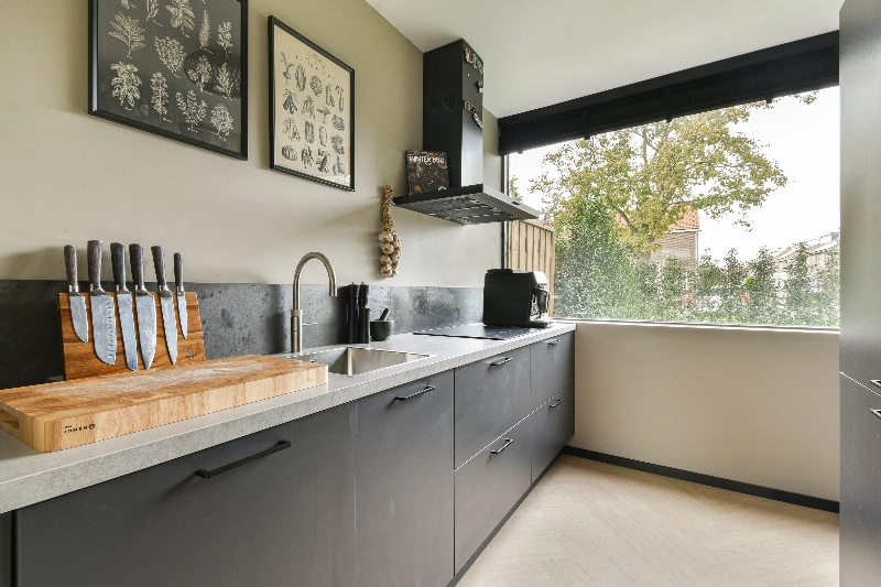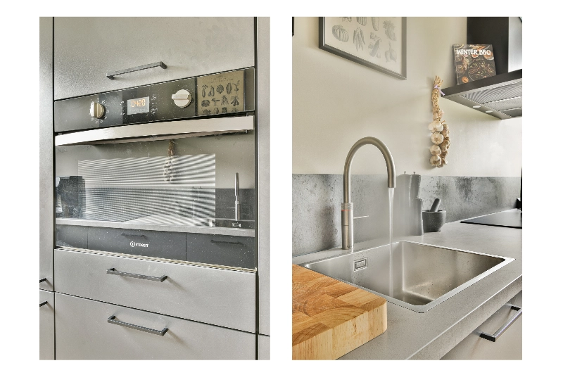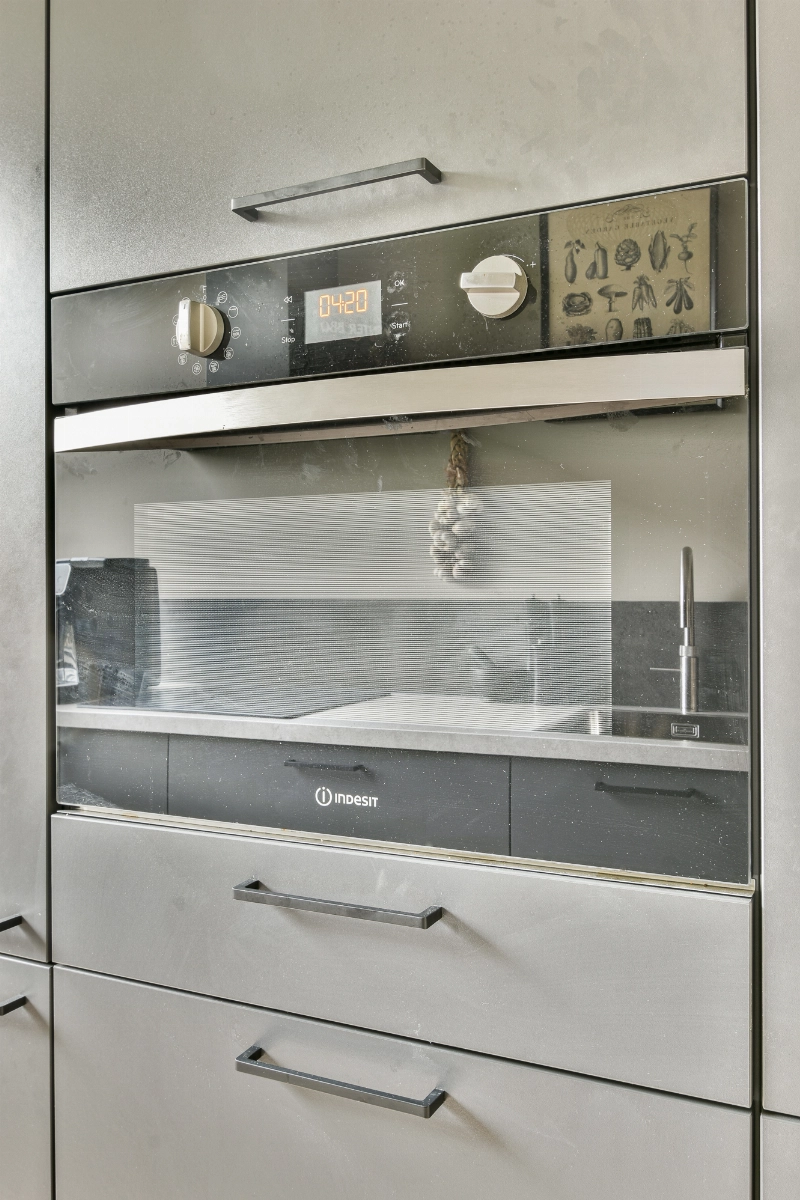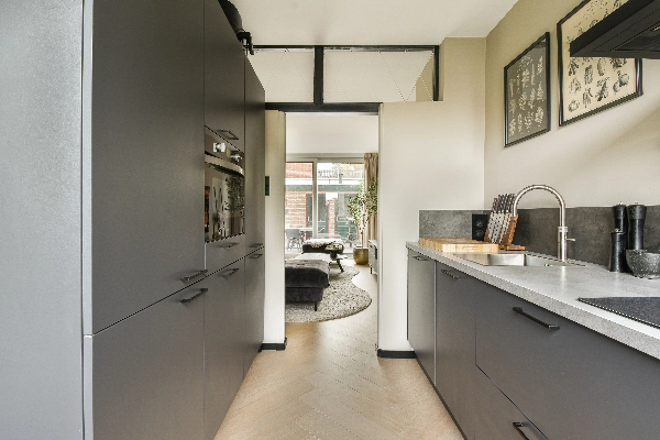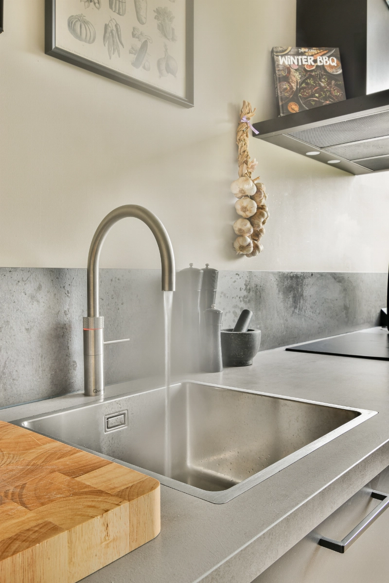 Aan de voorzijde van de woning bevindt zich de moderne antracietgrijze keuken met een lichtgrijs aanrechtblad. De keuken is voorzien van diverse inbouwapparatuur, waaronder een inductiekookplaat met afzuigkap, spoelbak met Quooker-kraan, vaatwasser, combi-oven en een koel-/vriescombinatie. Dankzij de vele kasten en lades is er volop opbergruimte.