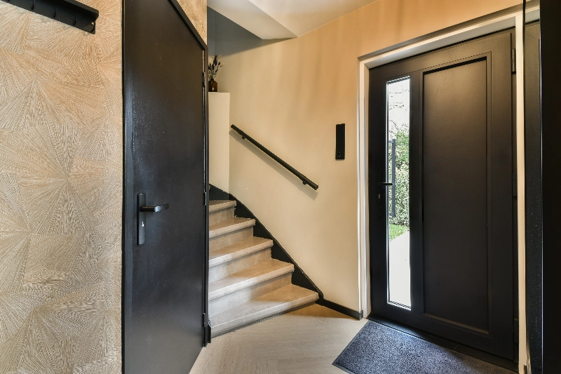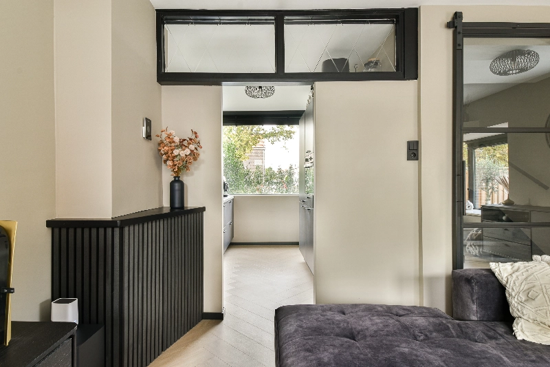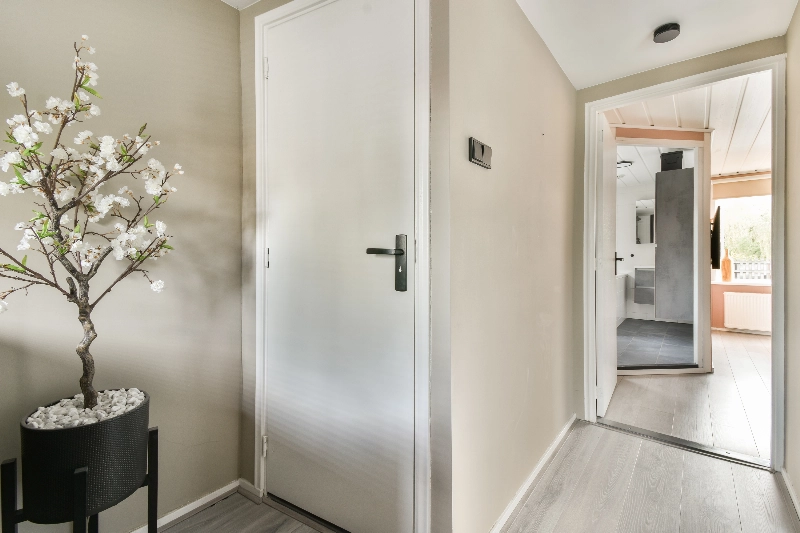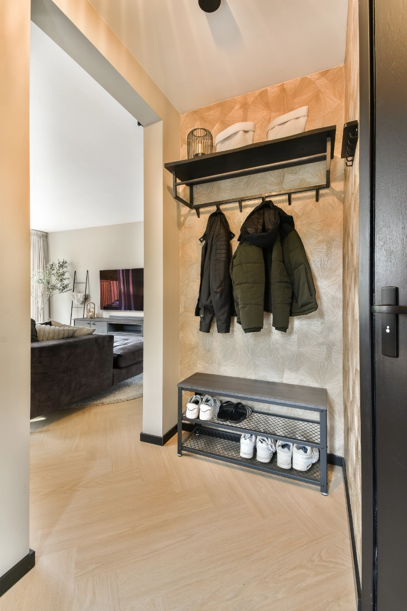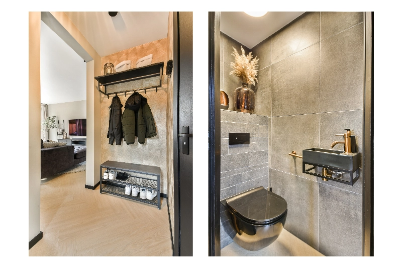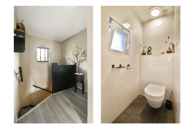Via de keurig aangelegde zijtuin met bestrating en groenblijvende beplanting kom je bij de entree van de woning. Je stapt binnen via de nieuwe voordeur in de ruime hal, waar zich de moderne toiletruimte met hangend closet en fonteintje bevindt, evenals de trapopgang naar de verdieping. Via de stoere staallook deur kom je in de woonkamer.