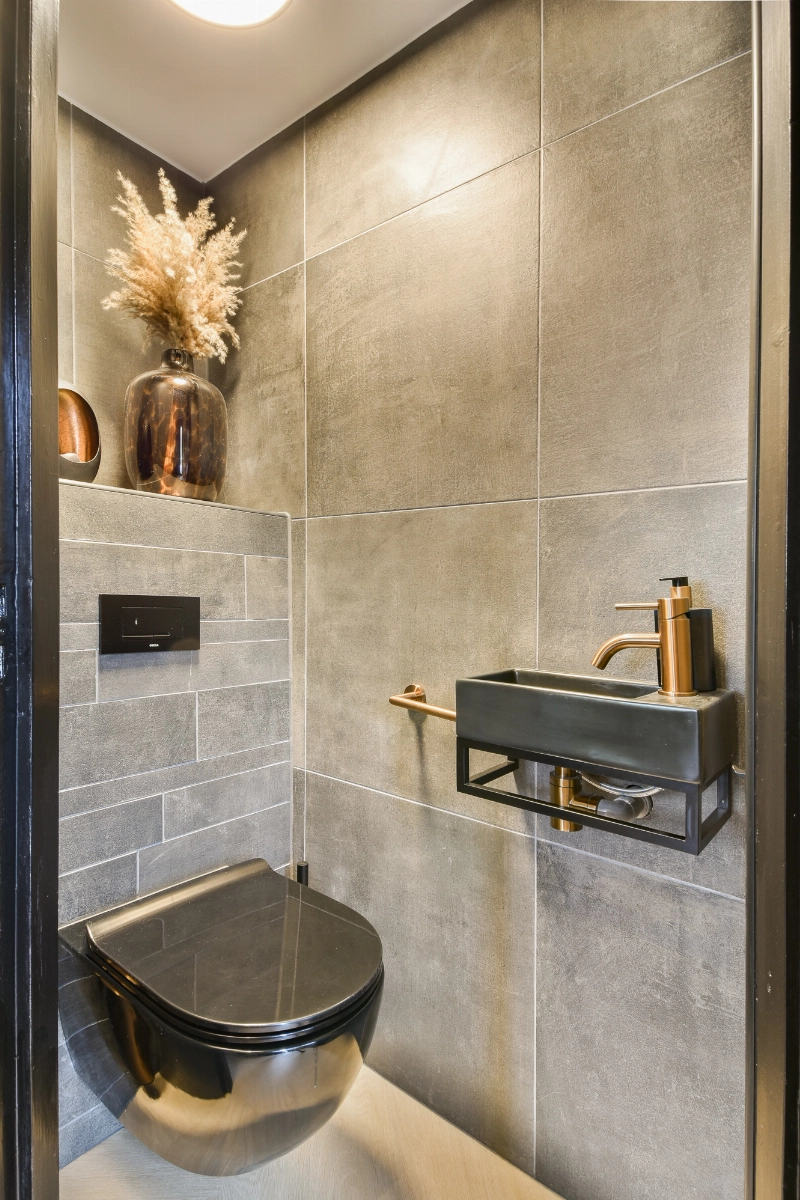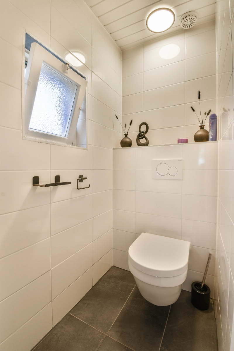De moderne toiletruimte is uitgevoerd met witte wandtegels, antracietkleurige vloertegels en een hangend closet.
