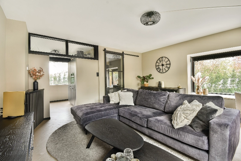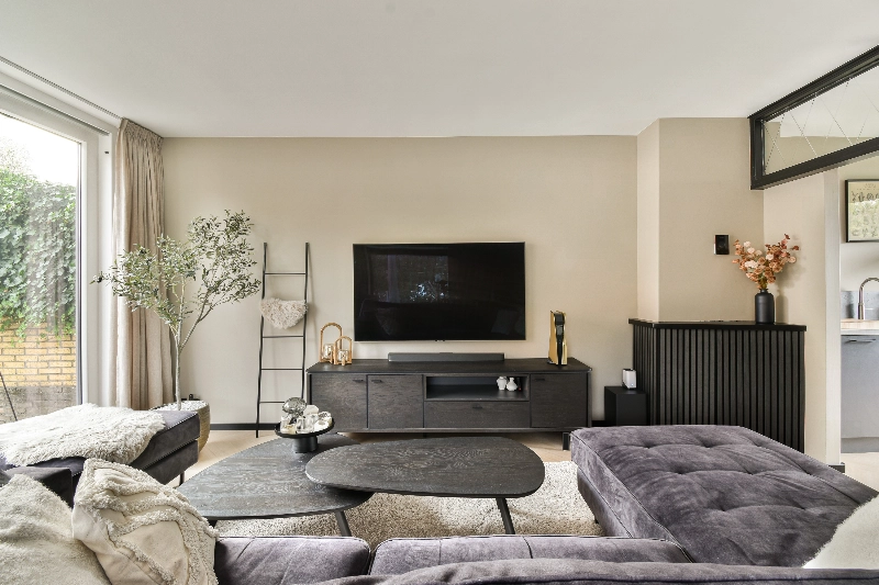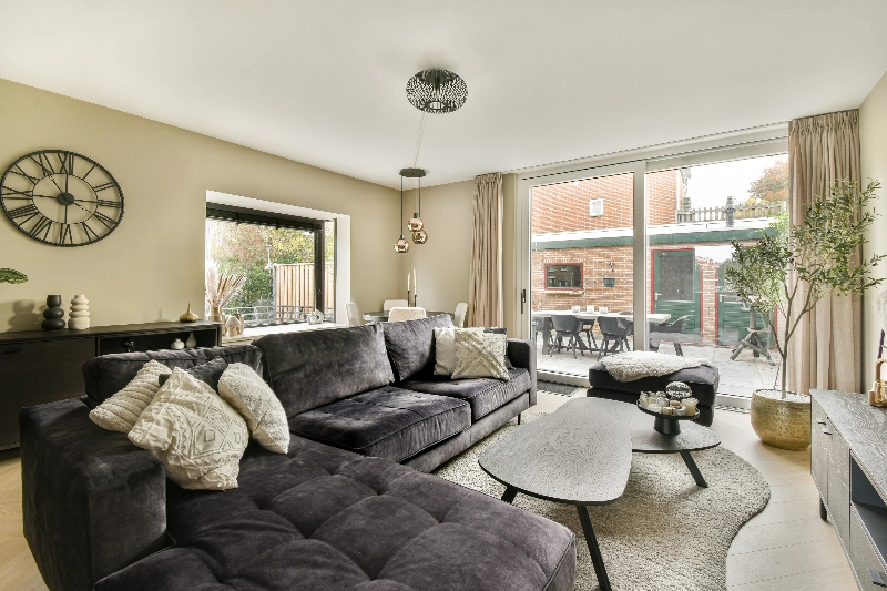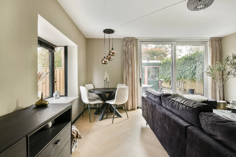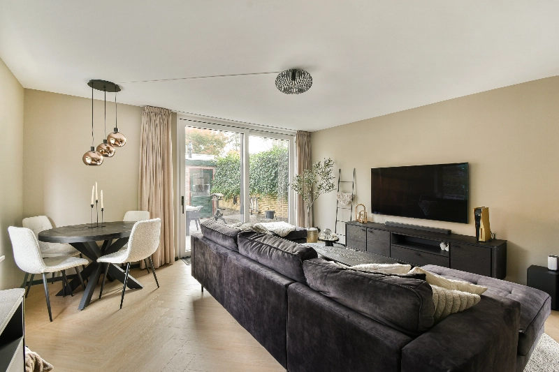 De lichte en ruime woonkamer heeft een mooie visgraat pvc-vloer met vloerverwarming en strak afgewerkte wanden en plafonds. Via de grote schuifpui bereik je de in 2025 nieuw aangelegde tuin met nette bestrating en heb je tevens toegang tot de ruime garage.