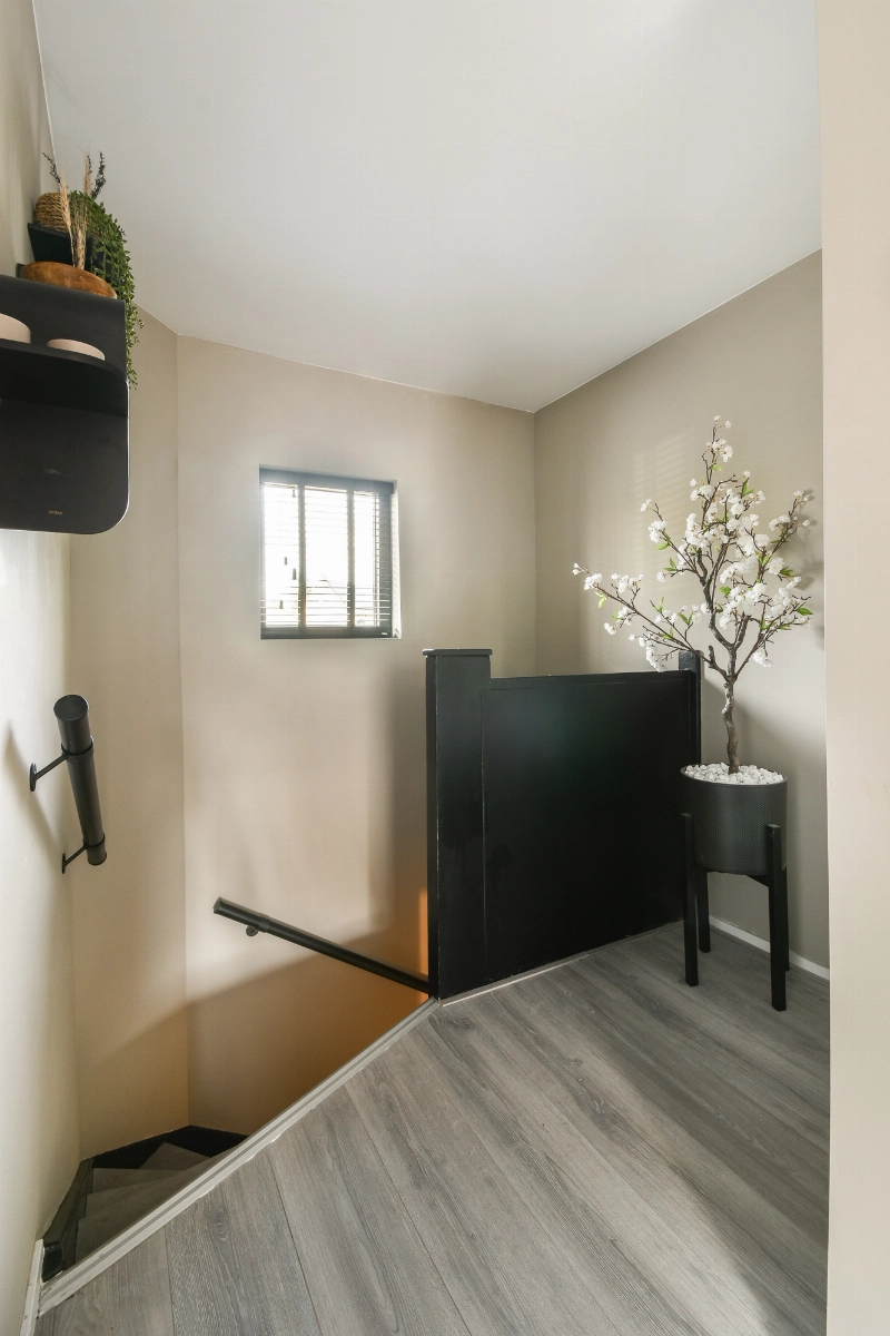 De trap naar de verdieping is onlangs ook gerenoveerd met mooie betonlook overzettreden. De ruime overloop heeft een lichte houtlook laminaatvloer welke doorloopt naar de slaapkamers.