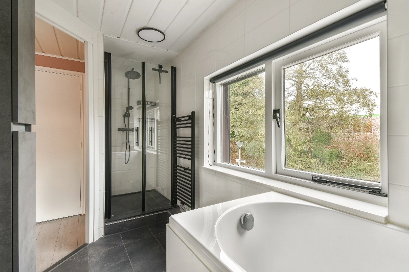 De ruime en moderne badkamer is in dezelfde stijl betegeld en voorzien van een ligbad, een modern wastafelmeubel met spiegelkast, een designradiator en een ruime inloopdouche met glazen deur en stortdouche.